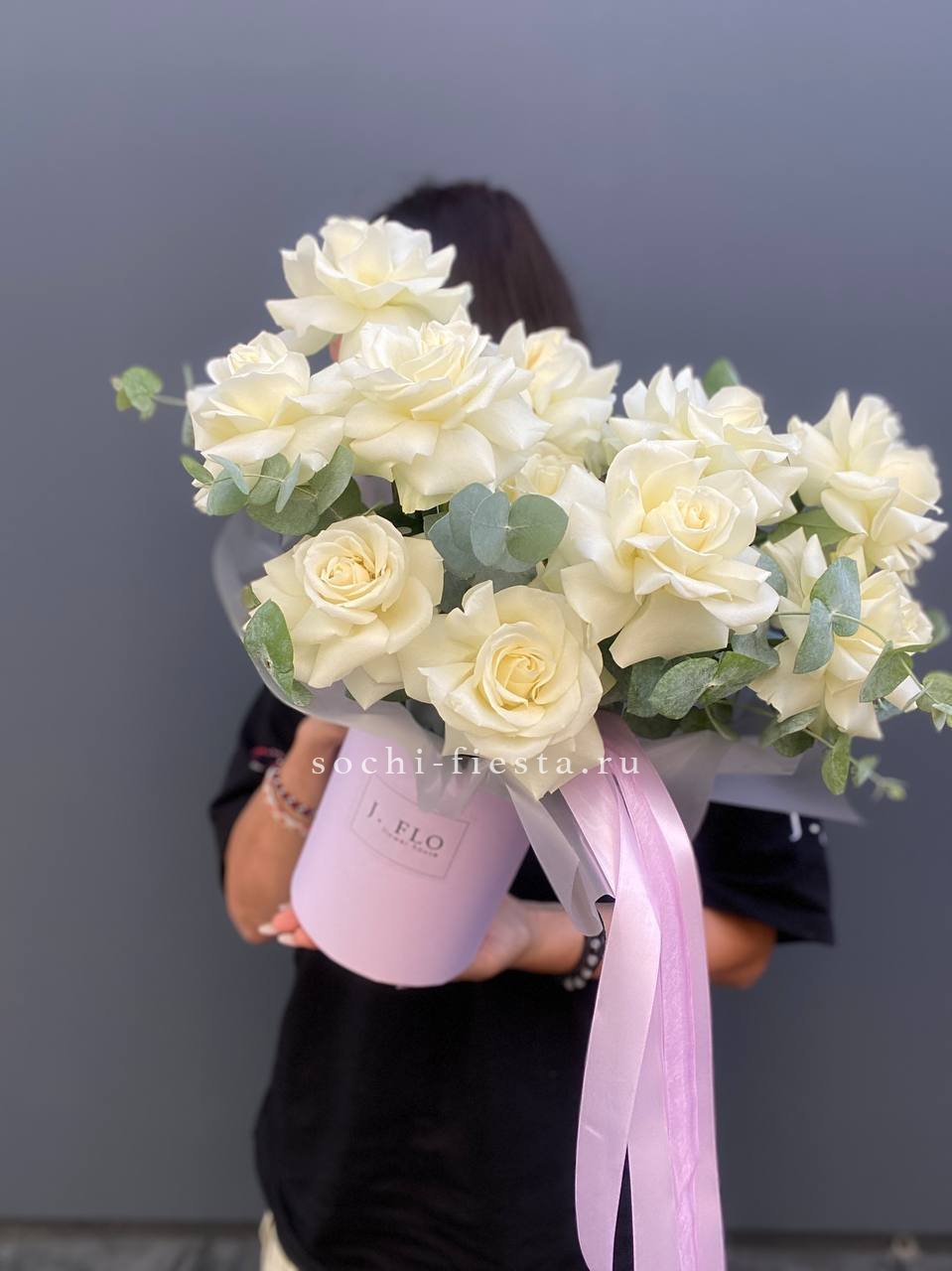 Тысяча и одна роза собраны в объёмную корзину, где каждый белоснежный бутон создаёт плотное облако лепестков. Это композиция, которая заполняет пространство и меняет восприятие комнаты одним своим присутствием.
