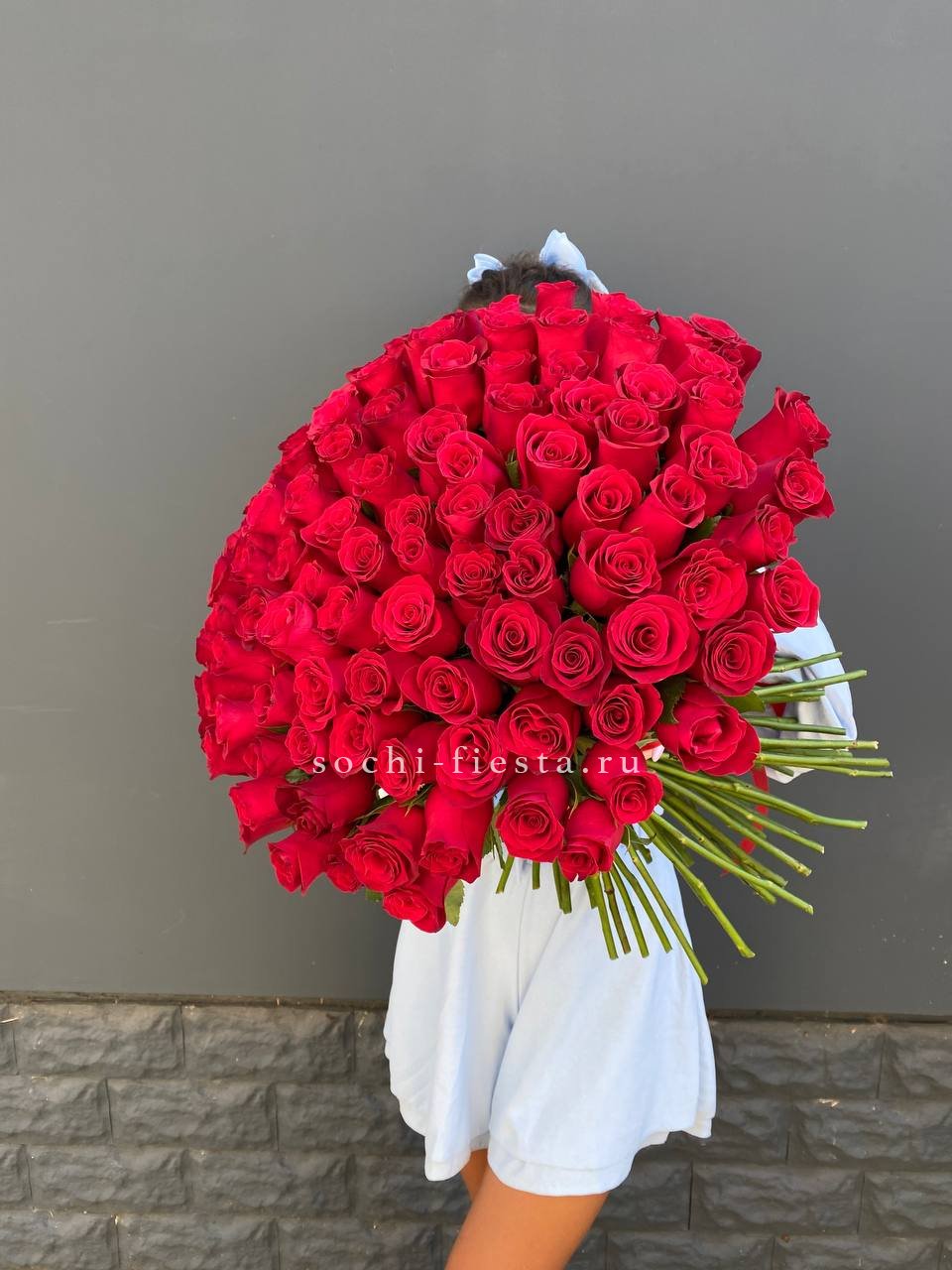 Монобукет из ста одной розы выстроен вертикальными линиями стеблей и плотной шапкой бутонов. Чистый красный цвет без примесей. Формат для по-настоящему значимых событий.