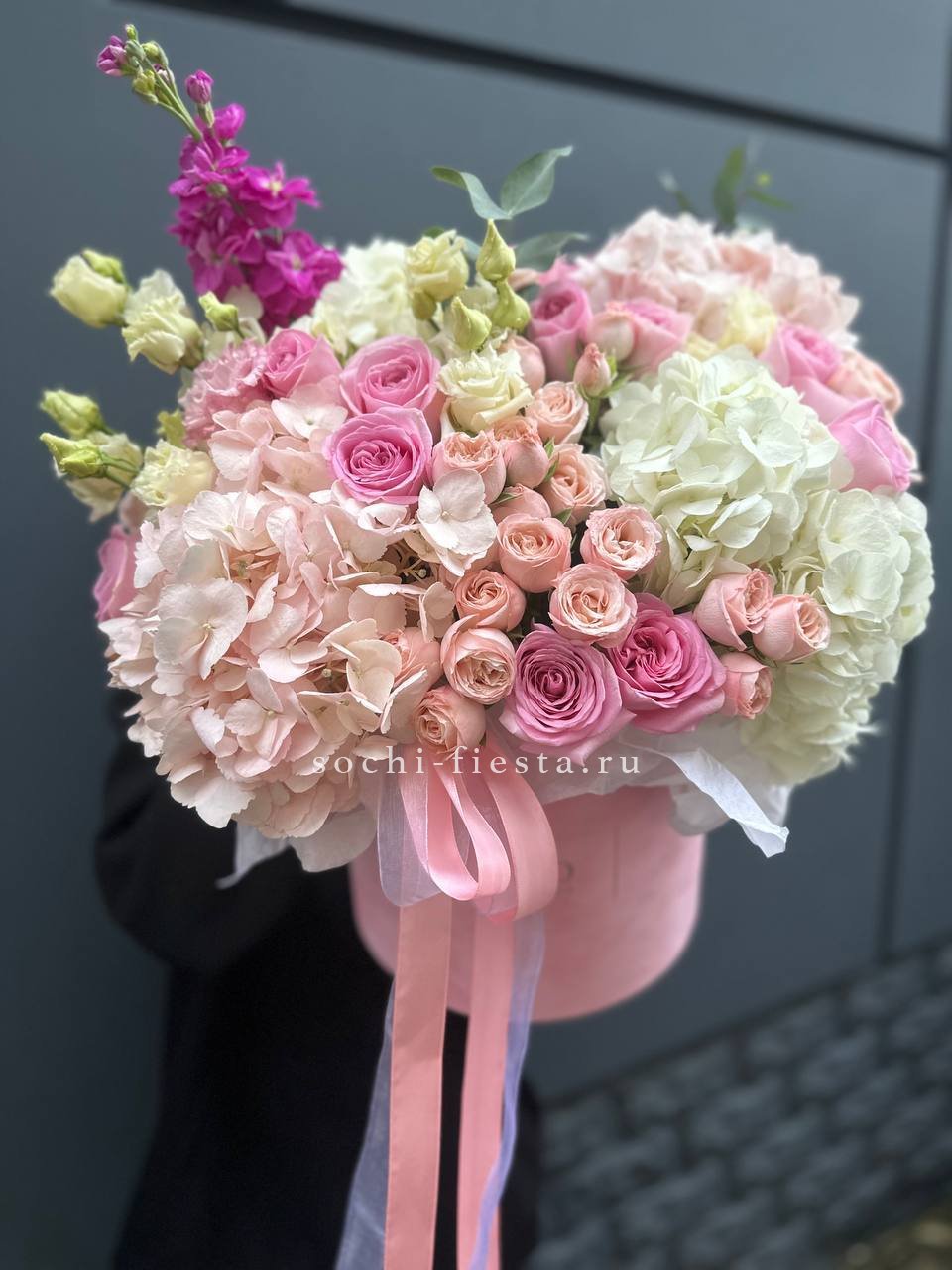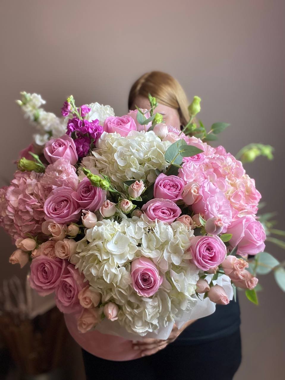 Пять крупных соцветий гортензии в бело-розовой гамме образуют воздушную композицию с переливами света на лепестках. Букет выглядит объёмно и свежо, наполняя пространство мягким цветом.