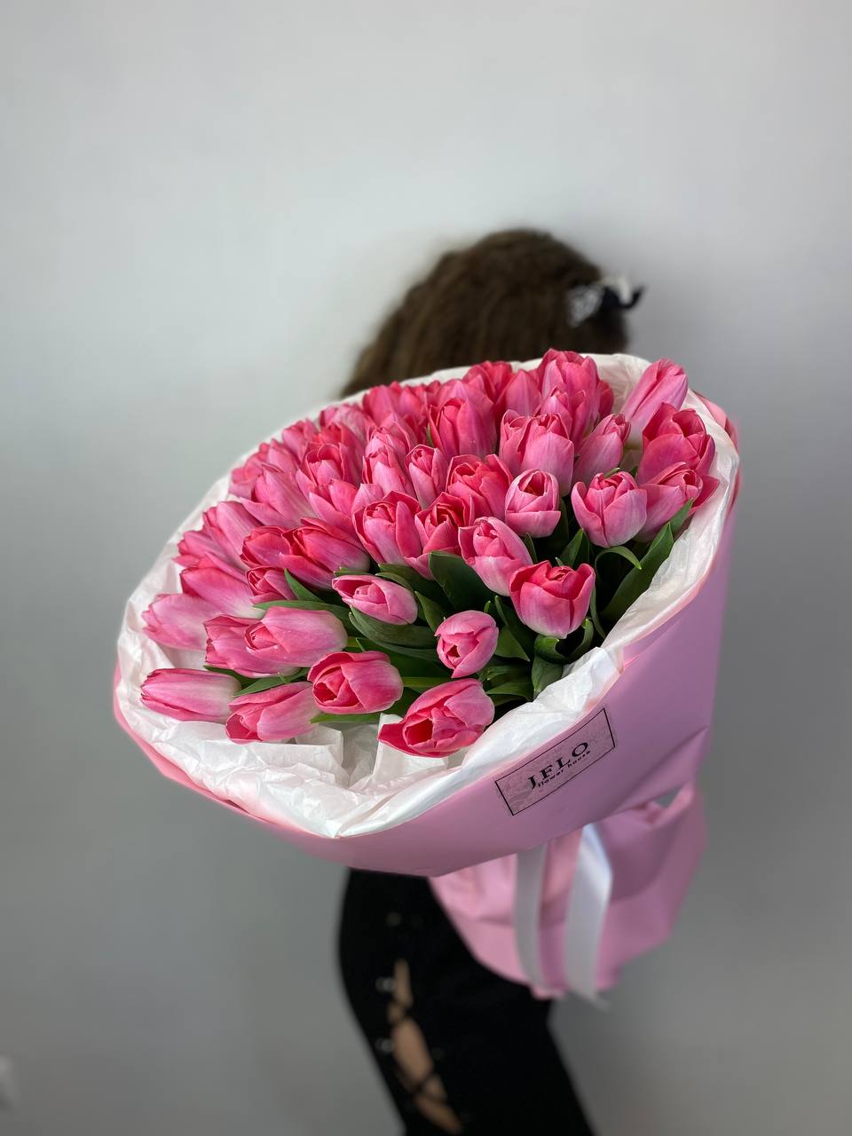 Букет из пятидесяти одного розового тюльпана держит форму благодаря плотной сборке и остается свежим долгое время. Практичное решение для тех, кто ценит естественную красоту без лишнего декора.
