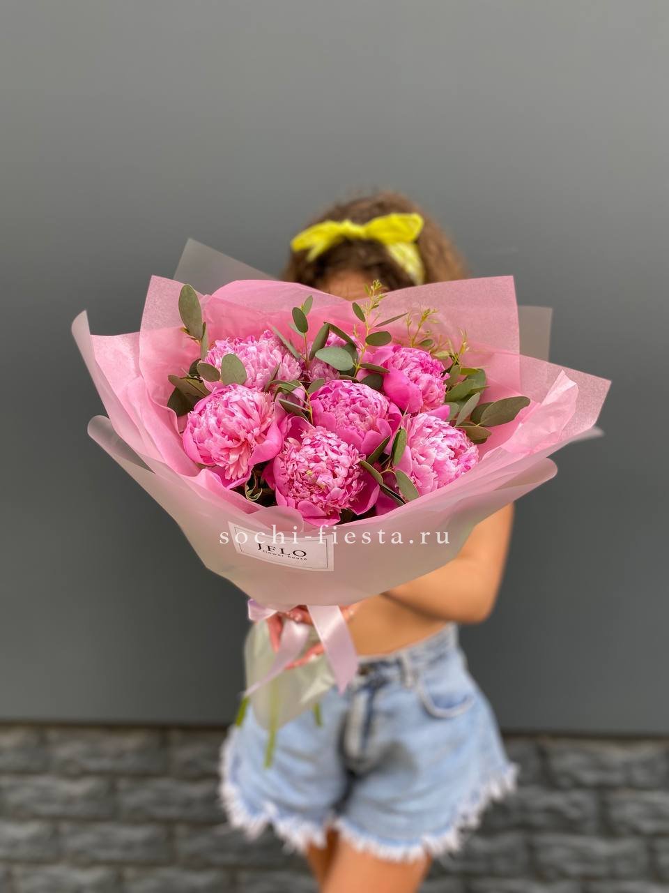 Семь ярких пионов в окружении эвкалипта образуют компактную композицию с выразительным силуэтом. Зелень добавляет графичности, а воздушное тишью создаёт лёгкую дымку вокруг соцветий.