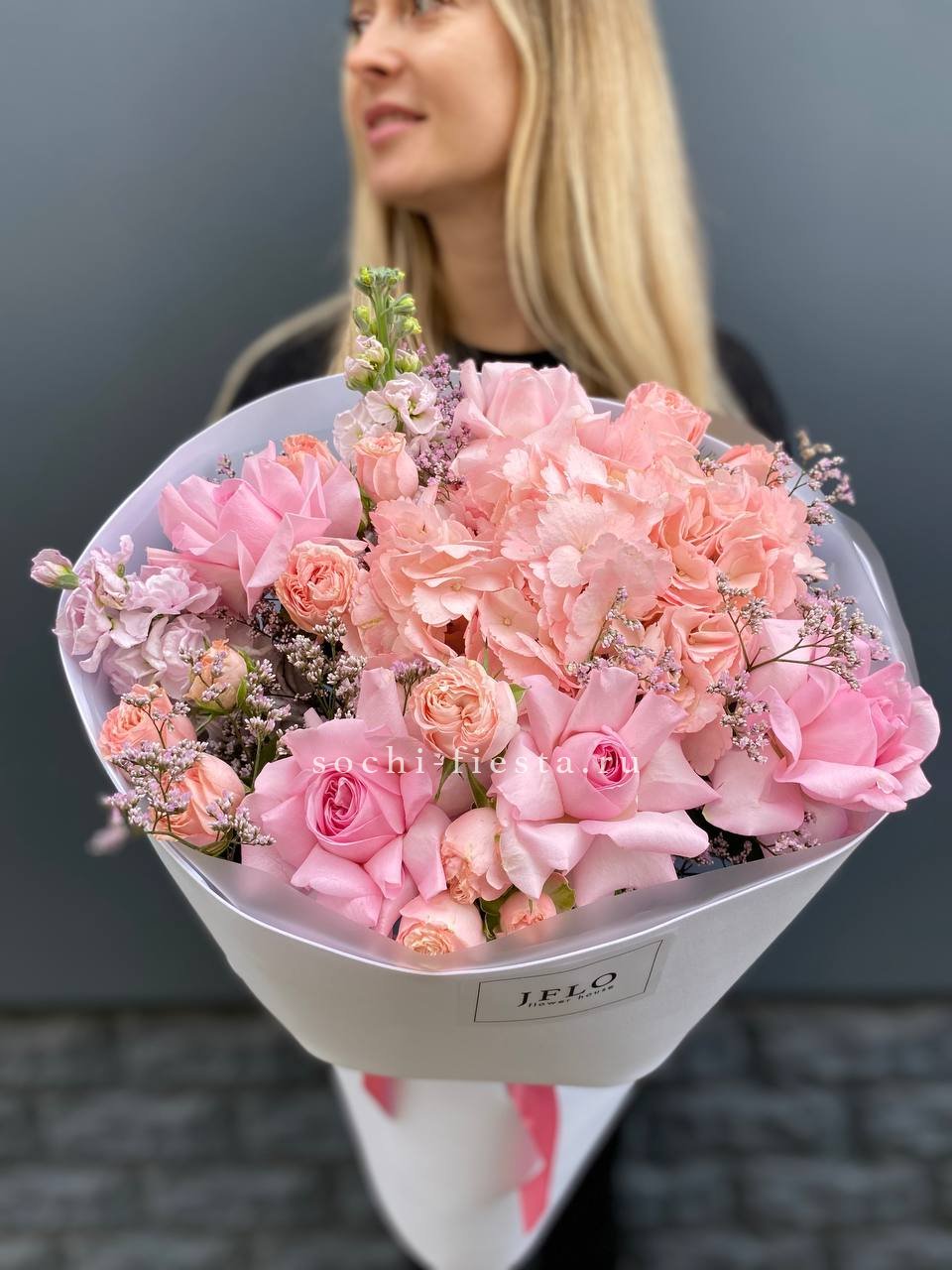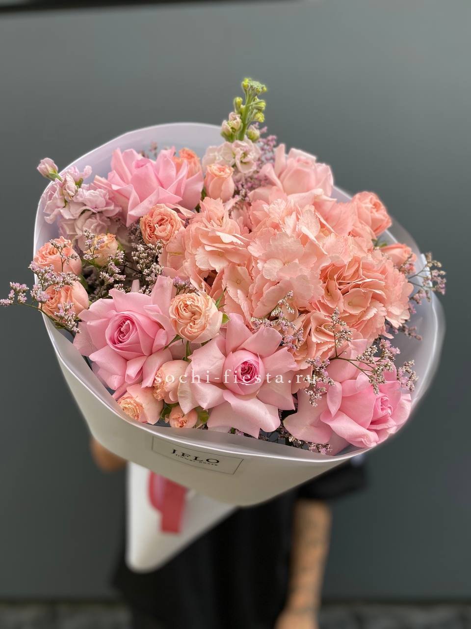 гортензия нежно-розовых оттенков, эустома, львиный зев или маттиола, розовые розы, эвкалипт, вспомогательная зелень, лента, светлая корзин.