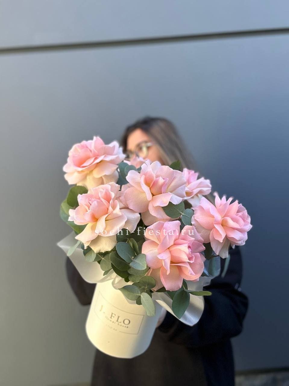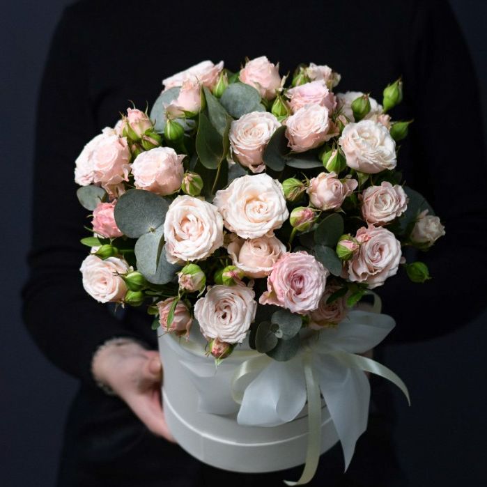 Пышная композиция в круглом боксе объединяет розы, эустому, хризантемы и диантус в плотную цветущую массу. Бомбастик добавляет объёма, а эвкалипт смягчает переходы между соцветиями. Готовое решение для размещения на столе или комоде.