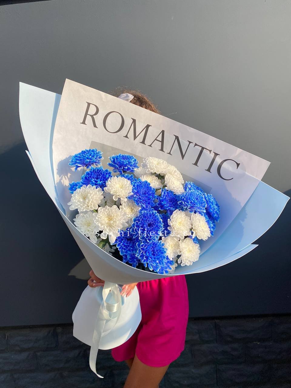 Девять веток кустовой хризантемы в синих оттенках собраны в плотный букет с лаконичной упаковкой. Насыщенный цвет и компактная форма создают яркое визуальное пятно в любом интерьере.
