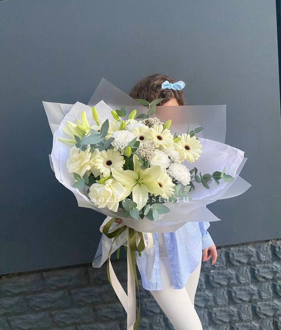 Яркие герберы и белоснежные лилии создают жизнерадостную композицию с чистым силуэтом. Озотамнус добавляет воздушности, а розы завершают образ свежестью и лёгкостью.