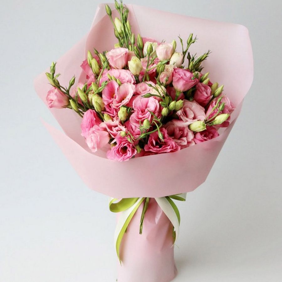 эустома - 5 шт., эвкалипт, лента, дизайнерская упаковка.