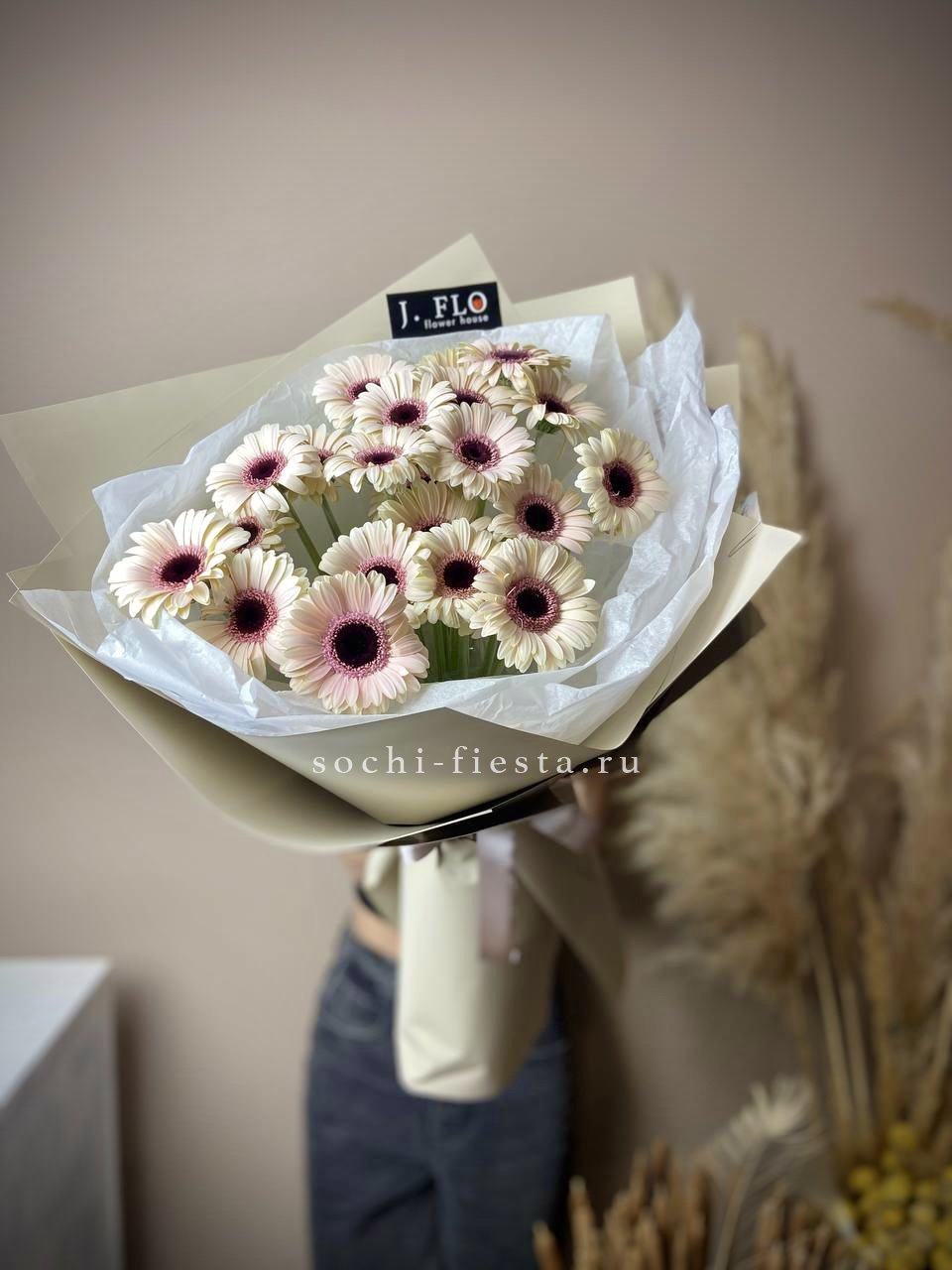 голландская гербера 21 шт., лента, дизайнерская упаковка Оттенок гербер может быть согласован с заказчиком.