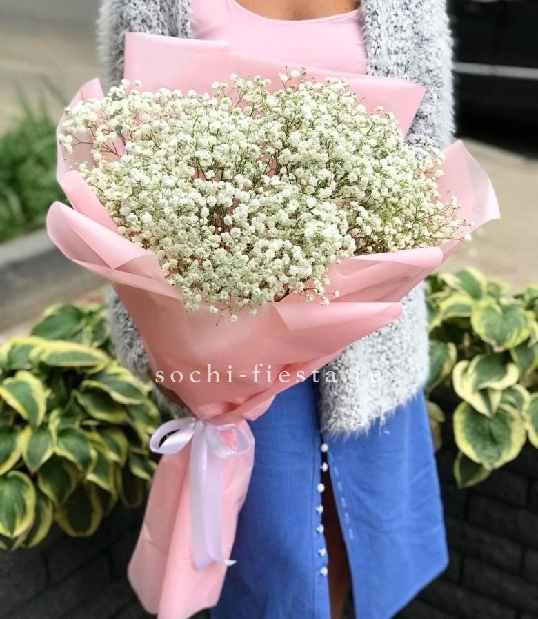 Одиннадцать веток гипсофилы с мелкими соцветиями в комбинированной упаковке из фоамирана. Белые облачка цветов сохраняют форму и долго радуют глаз.
