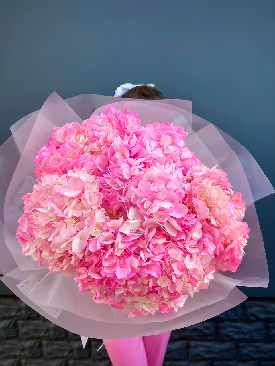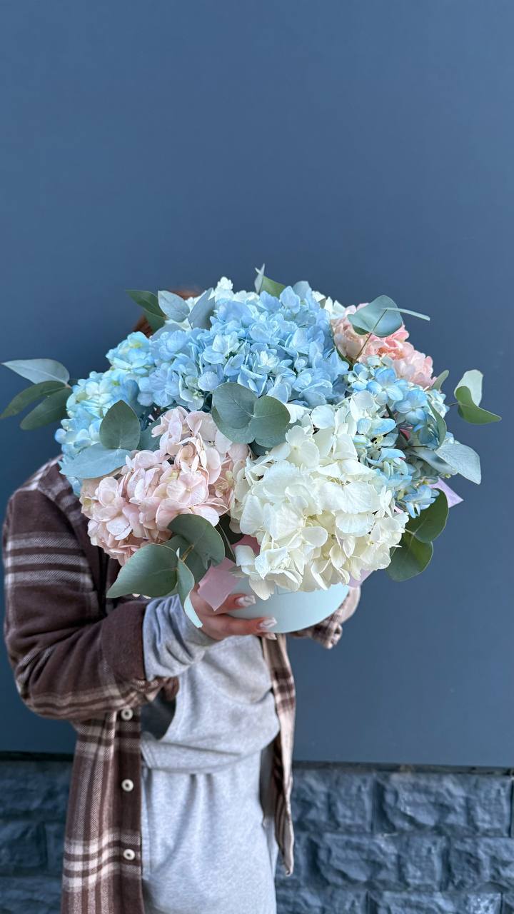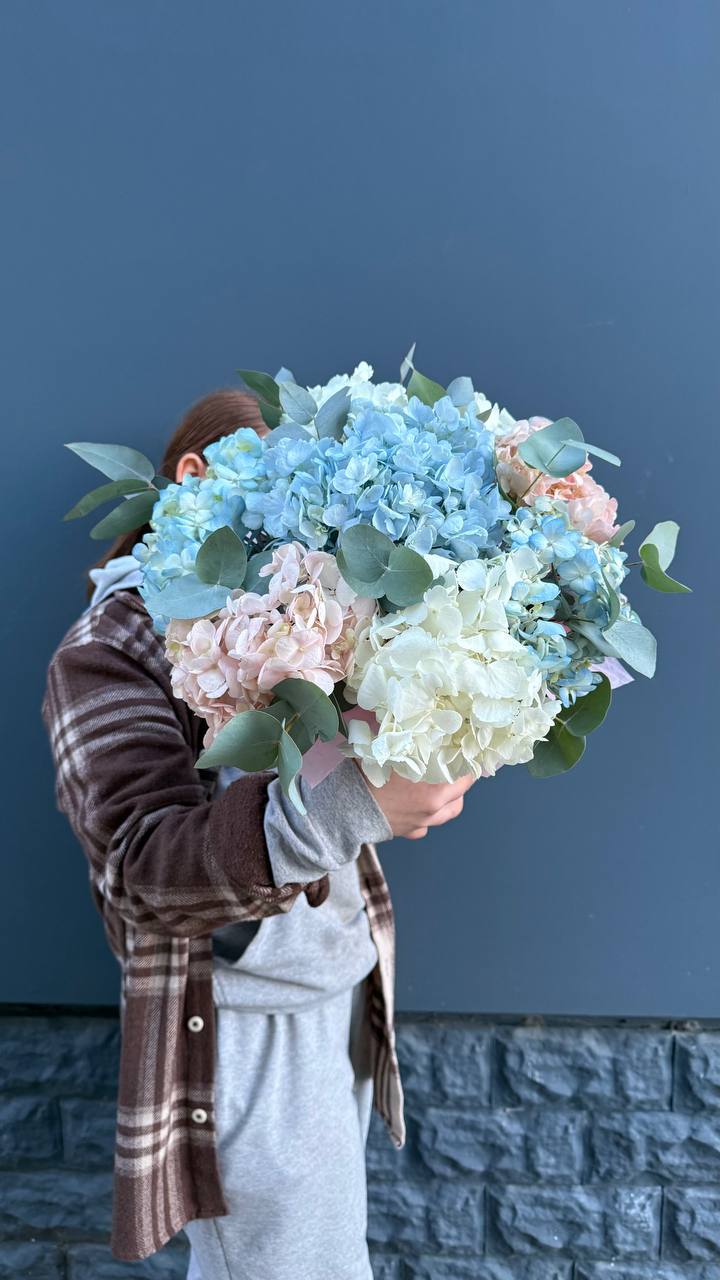Девятнадцать соцветий гортензии собраны в объемную композицию с естественной воздушностью. Каждая головка раскрывается множеством мелких лепестков, создавая плотное цветовое облако.