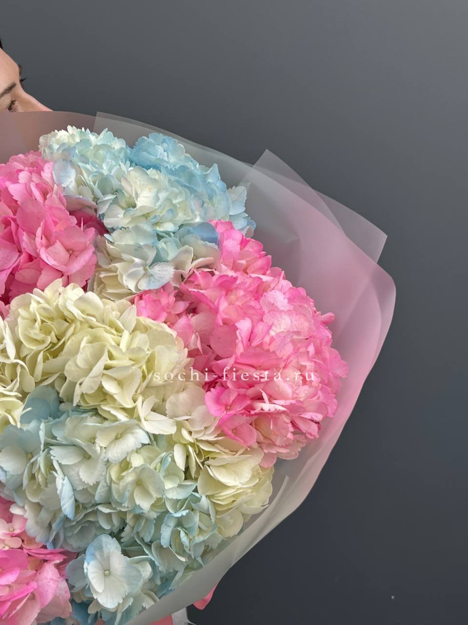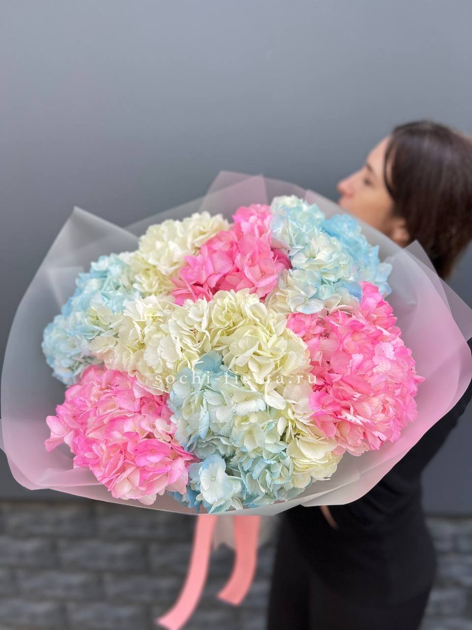 Двадцать пять соцветий гортензий разных оттенков формируют пышное облако с естественной игрой цвета. Каждая головка раскрывается по-своему, создавая живую фактуру без четких границ между тонами.