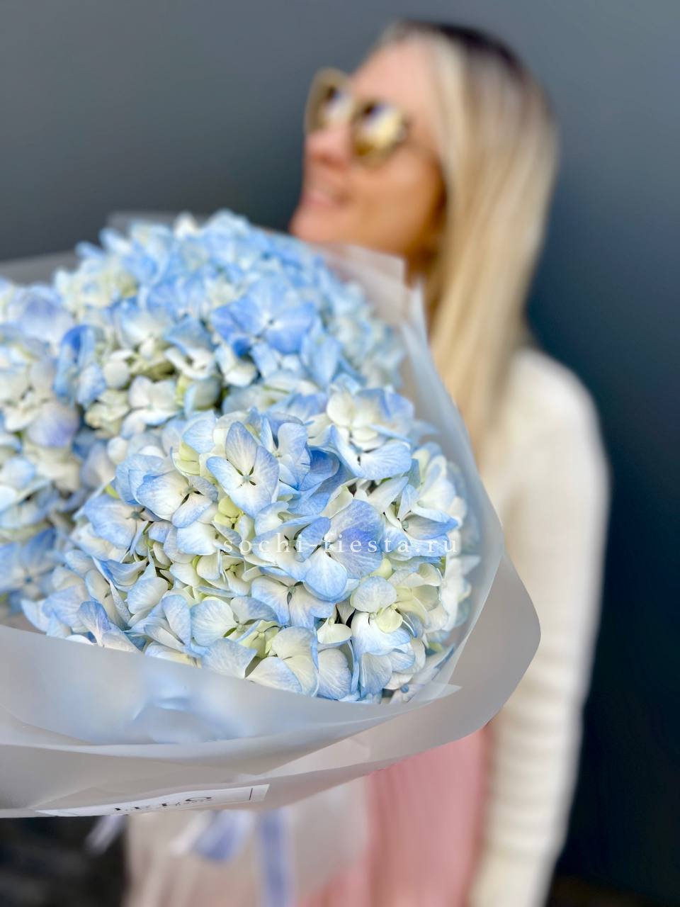 гортензия, эвкалипт, лента, дизайнерская упаковка.
