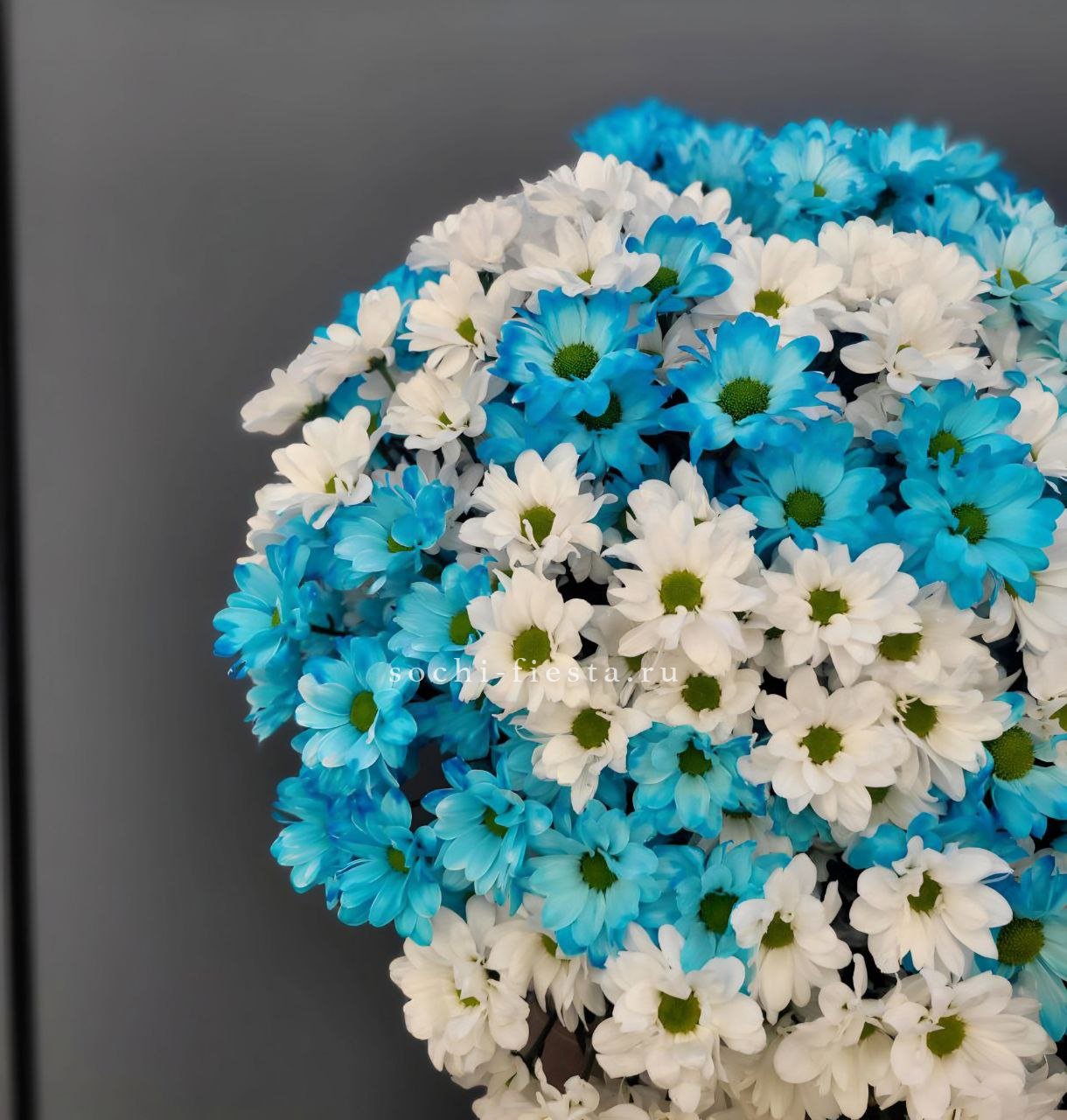 Пятьдесят одна ветка кустовых хризантем в миксе оттенков — это впечатляющий объем и буйство красок. Первый взгляд захватывает масштабом и многослойностью цветовой палитры.