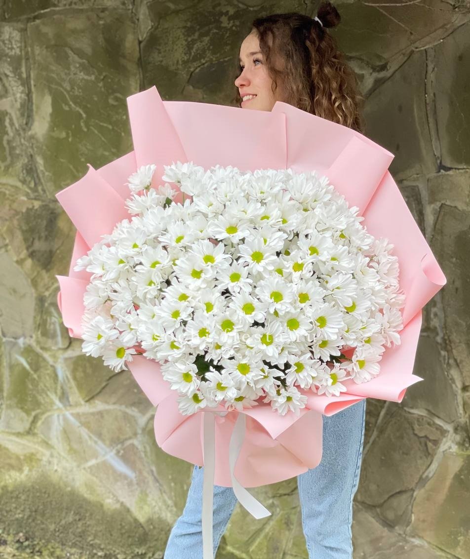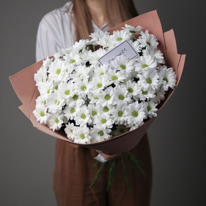 Пятнадцать веток кустовой хризантемы в натуральном крафте. Множество мелких соцветий формируют пышную шапку с естественной россыпью бутонов, подчёркнутую простотой оформления.