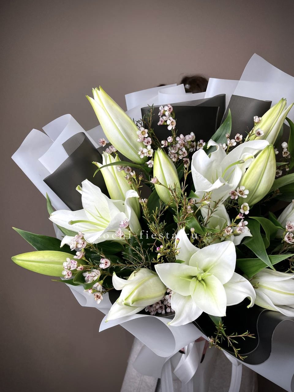 белые лилии - 5 шт., крафт, дизайнерская пленка.