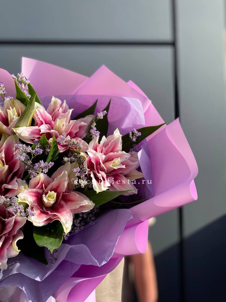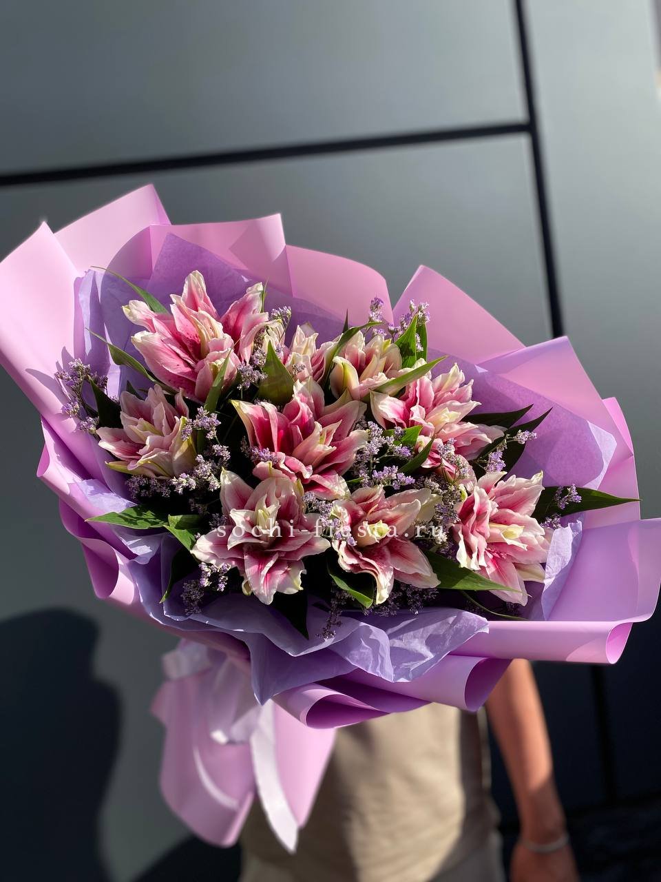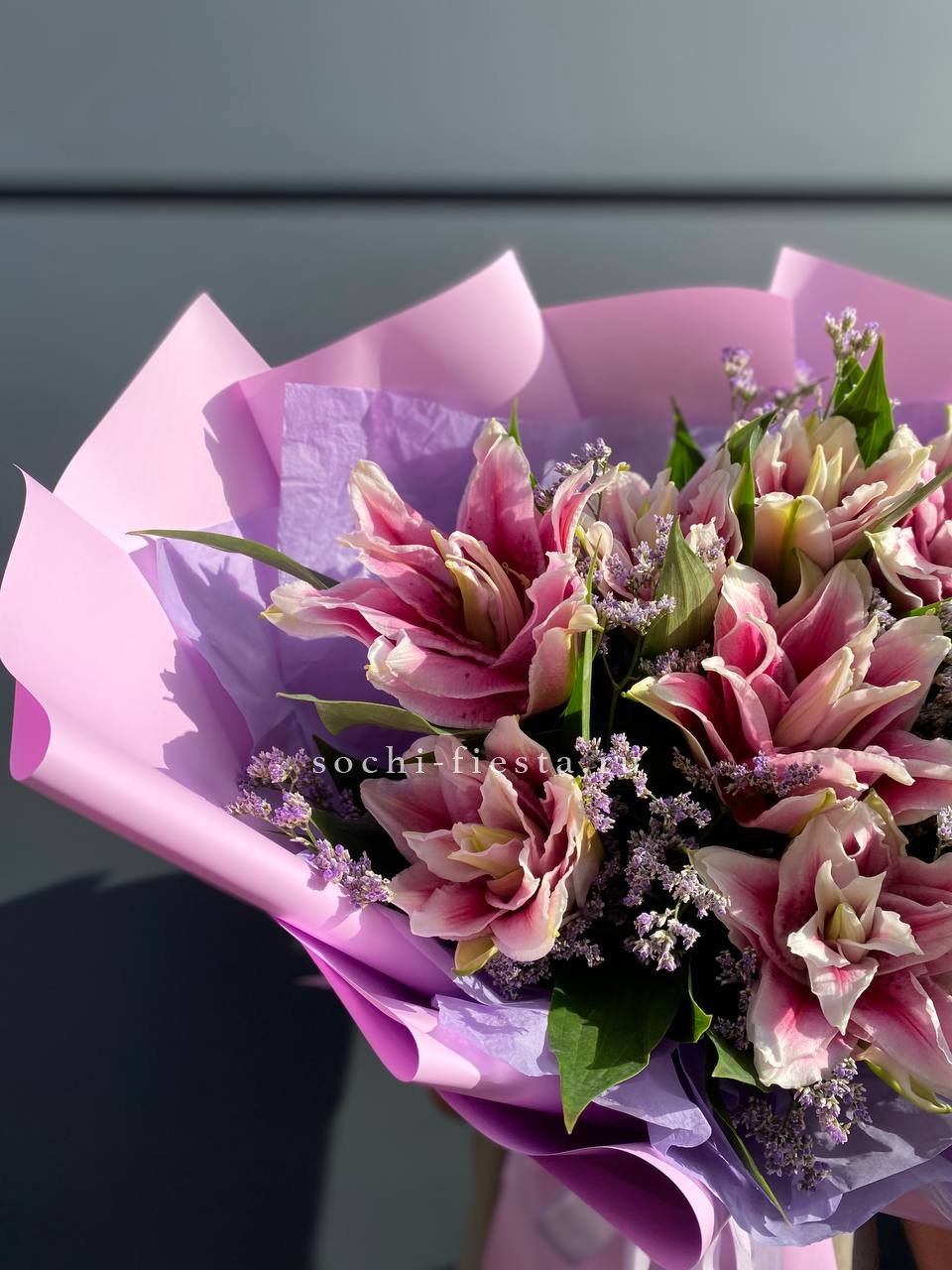 Пионовидные лилии с махровыми бутонами дополнены воздушным лимониумом. Девять стеблов образуют пышную форму, где каждый цветок раскрывается слоями.