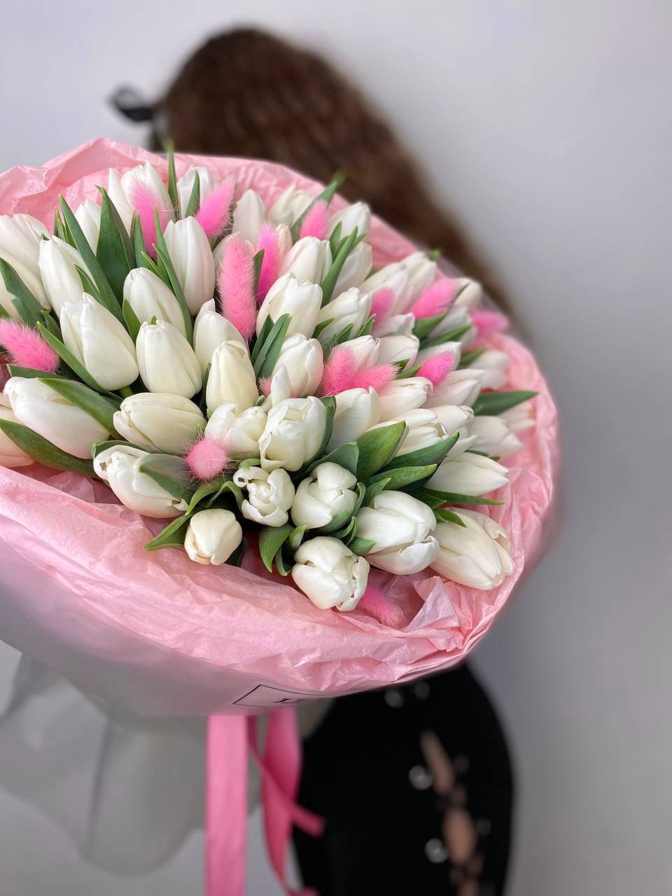 Сто один белоснежный тюльпан собран в плотную охапку с безупречной геометрией. Классическая упаковка сохраняет естественную красоту бутонов и подчёркивает масштаб композиции.