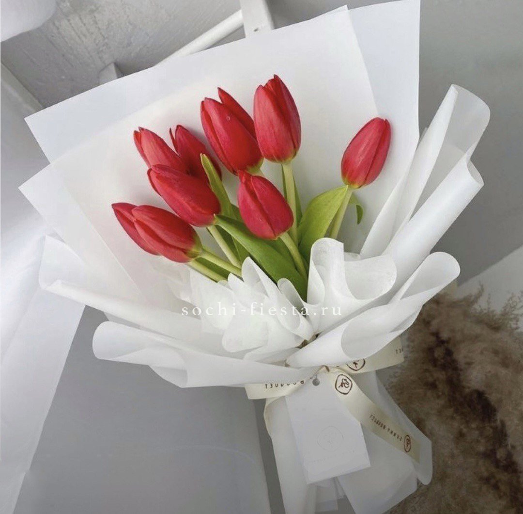 Состав букета: 39 тюльпанов, амарантус (аналог),  лента, упаковка.