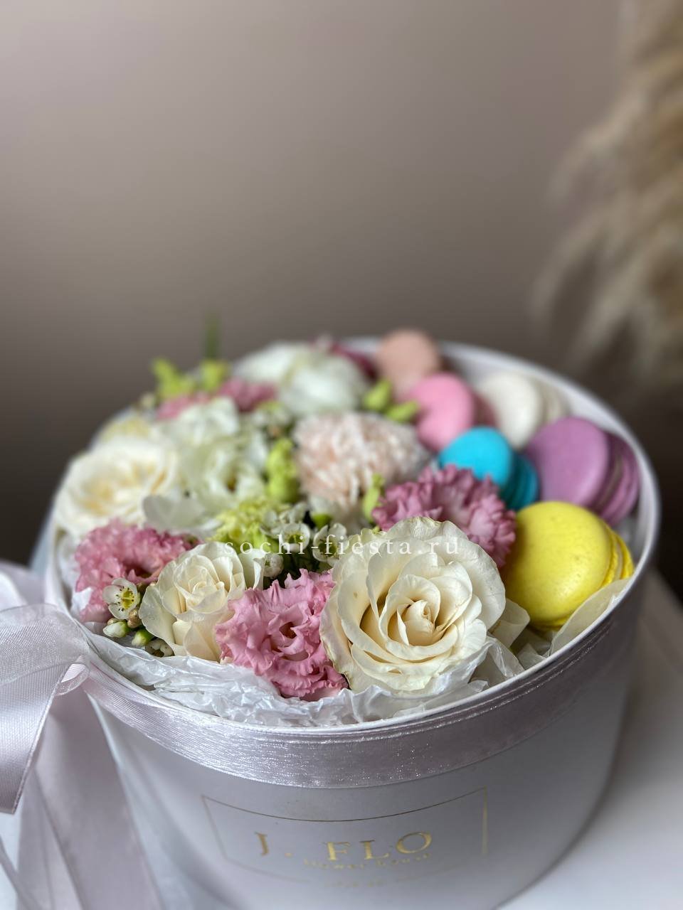 Для заказа товара "Цветы в цилиндре с макаронс "Прованс"" с доставкой в Владикавказе нажмите в корзину