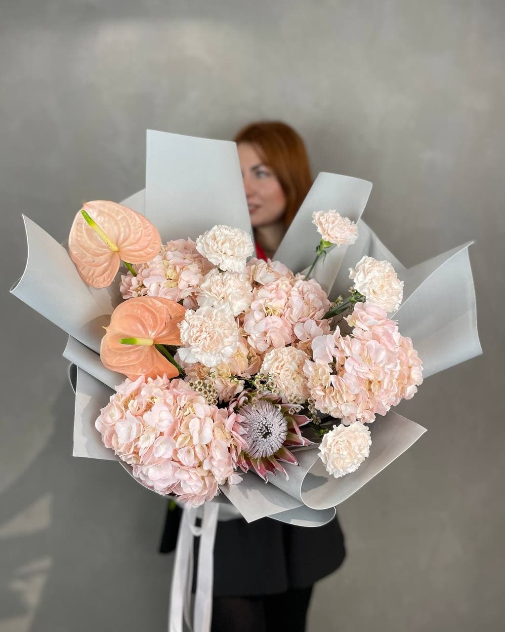 протея, роза кустовая, эустома, диантус, роза одноголовая, эвкалипт, озотамнус (по сезону) лента, дизайнерская упаковка.