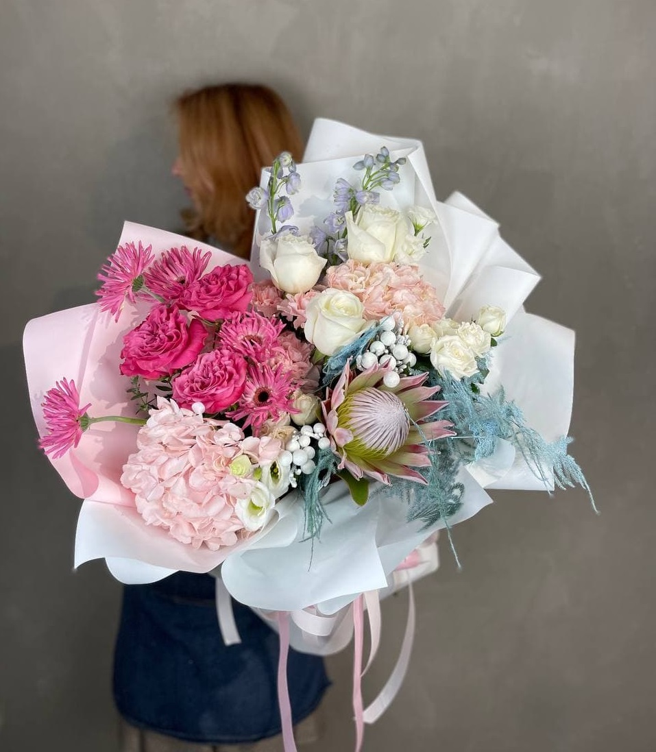 Протея задаёт графичный центр композиции, вокруг которого раскрываются розы и воздушная эустома. Диантус добавляет текстурные пятна, а эвкалипт смягчает линии. Букет с характером и выразительной архитектурой.