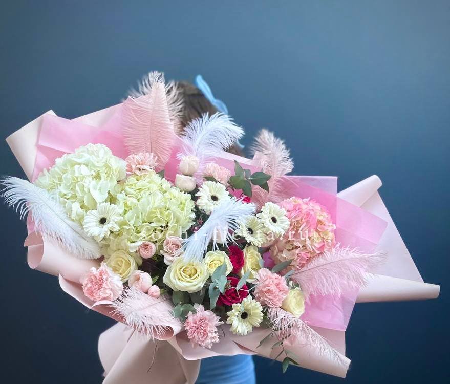 гортензии, роза одноголовая, роза кустовая, гербера, озотамнус, диантус, эвкалипт, декоративные перья, лента, дизайнерская упаковка.