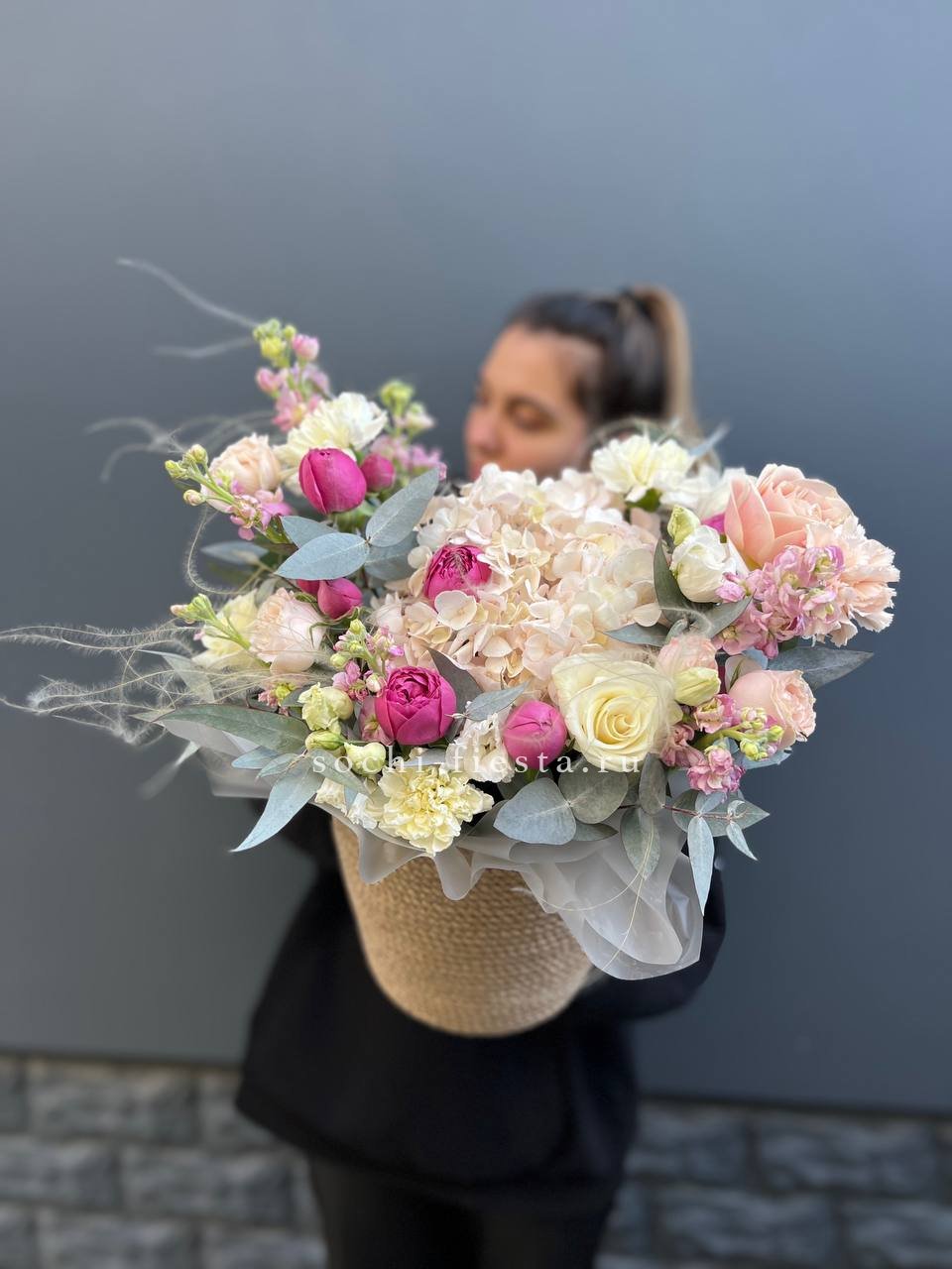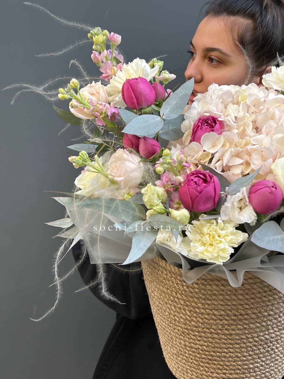 гортензия, бруния, диантусы (или эустома), пионовидная кустовая роза, эвкалипт, дизайнерское оформление.