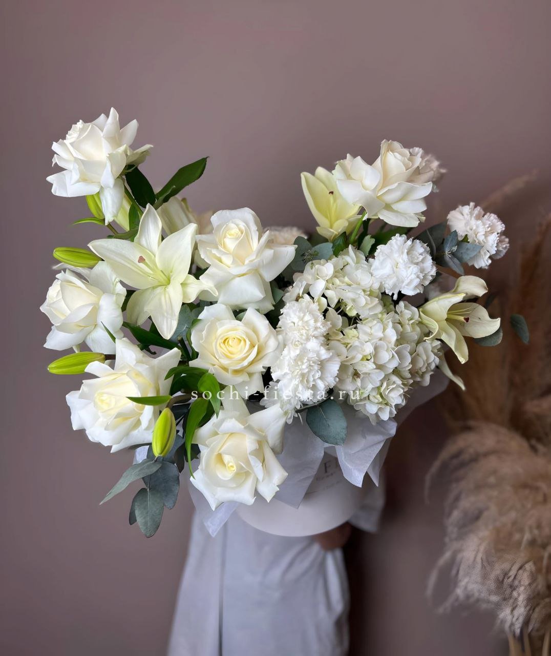 Пионовидные бутоны с волнистыми лепестками соседствуют с графичными диантусами и свежими ветками эвкалипта. Авторская упаковка завершает образ, добавляя композиции современное звучание.