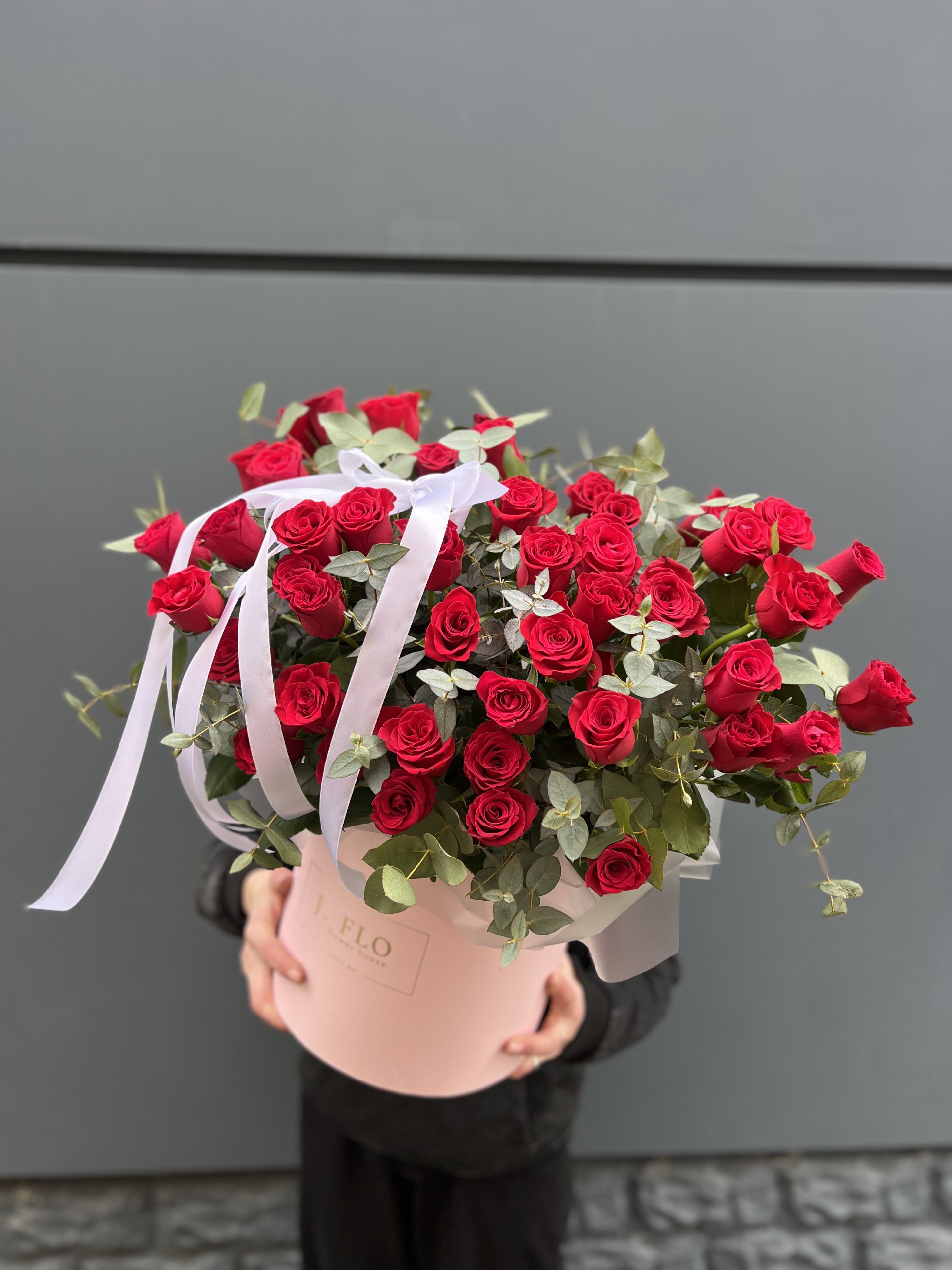 Плотная сборка с открытыми бутонами роз и воздушными соцветиями гортензии создаёт многослойную композицию. Белые каллы и маттиола добавляют вертикальные линии, а эвкалипт смягчает переходы между крупными формами.