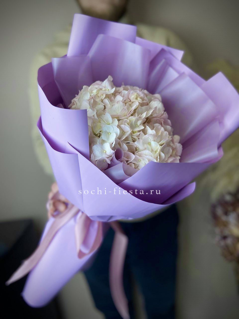 гортензия розовая, лента, дизайнерская упаковка. Цвет гортензий может незначительно отличаться.