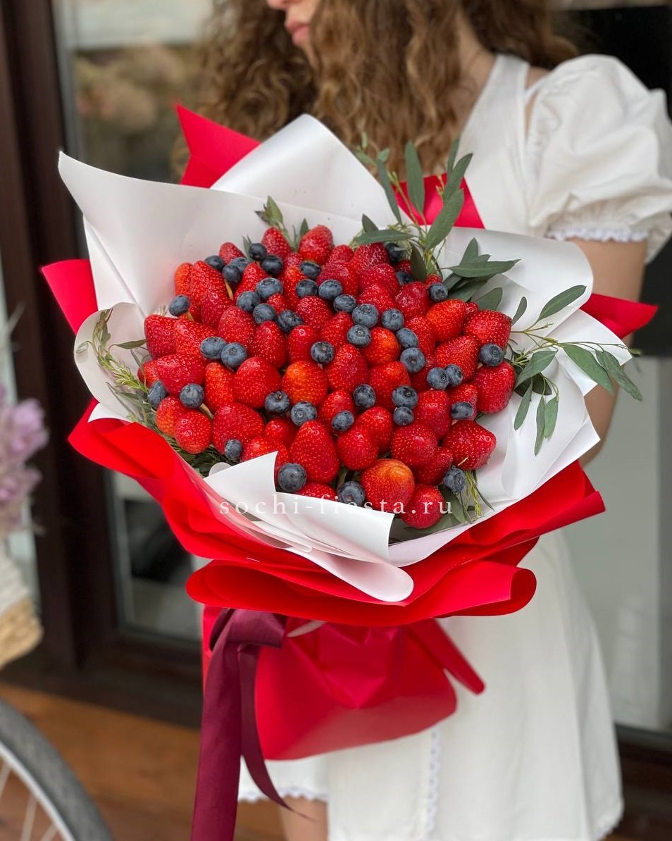 Алая клубника и синяя голубика собраны в объёмную композицию с мятой или эвкалиптом. Комбинированное оформление удерживает форму и позволяет разместить букет в любом пространстве.