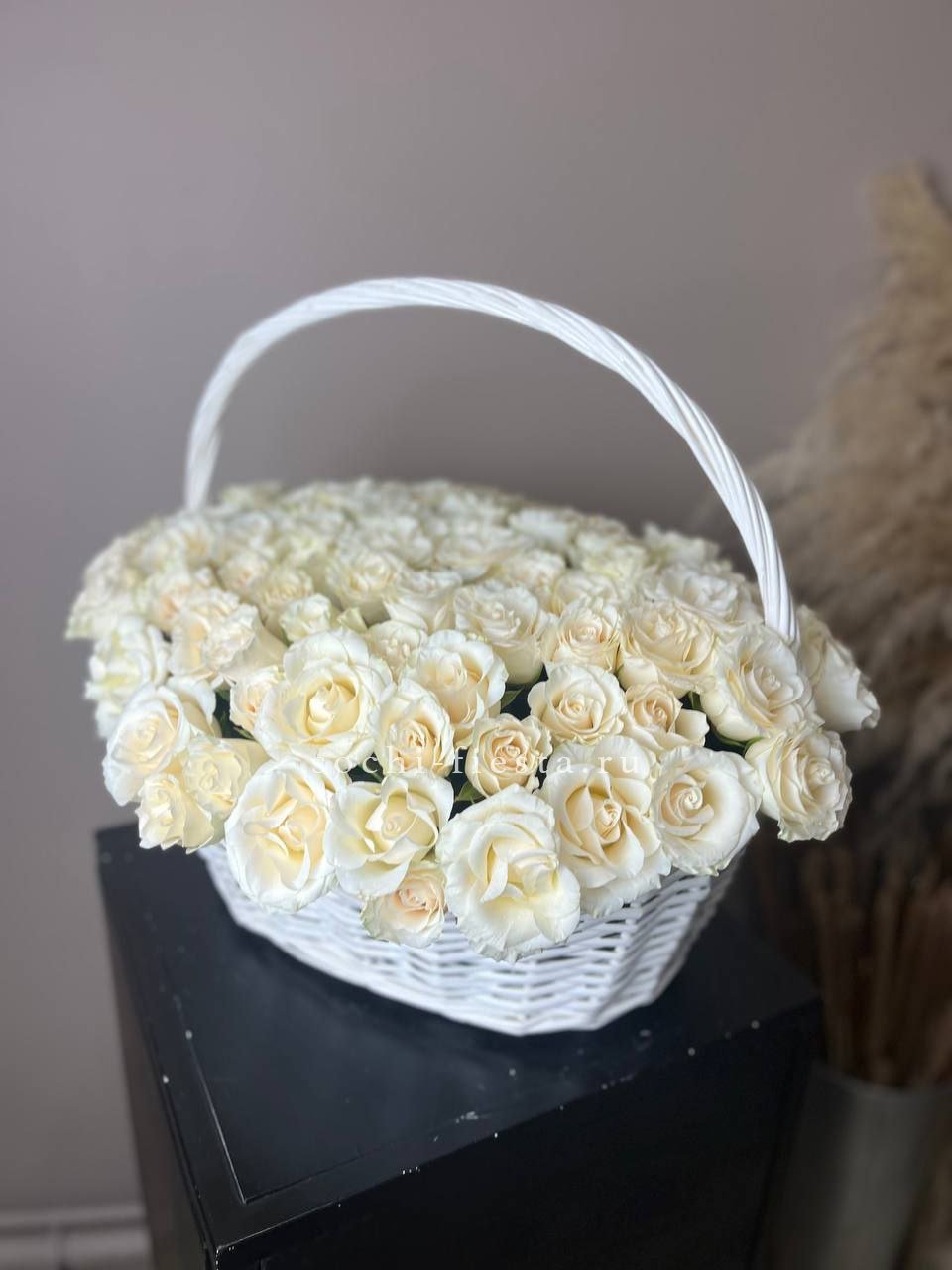 Белые розы и эустома образуют монохромную гамму с чистыми линиями. Эвкалипт добавляет свежести и завершает лаконичную форму композиции.