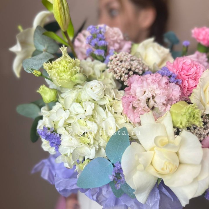 Наполнение подбирается под сезон. Зимой — амариллис, розы, ранункулюсы. Весной — тюльпаны, ранункулюсы, фрезия. Летом — пионы в мае-июне, гортензия в июле-августе. Осенью — хризантемы и декоративные травы.