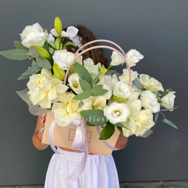 Коробка в студии Владикавказе — плотный картон с матовой поверхностью, иногда с тиснением логотипа. Внутри — флористическая губка (оазис), предварительно пропитанная водой. Сверху — атласная или шёлковая лента, декоративная тесьма, иногда фирменная открытка.
