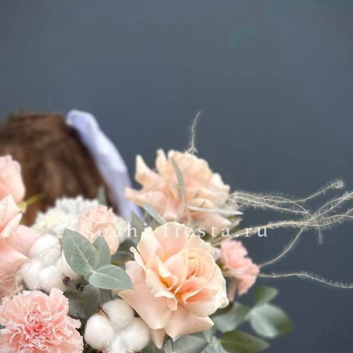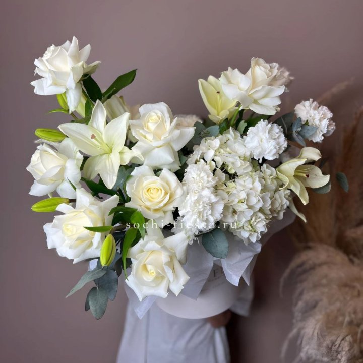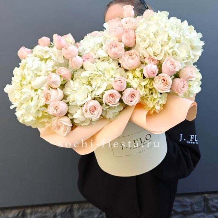 Наполнение подбирается под сезон. Зимой — амариллис, розы, ранункулюсы. Весной — тюльпаны, ранункулюсы, фрезия. Летом — пионы в мае-июне, гортензия в июле-августе. Осенью — хризантемы и декоративные травы.