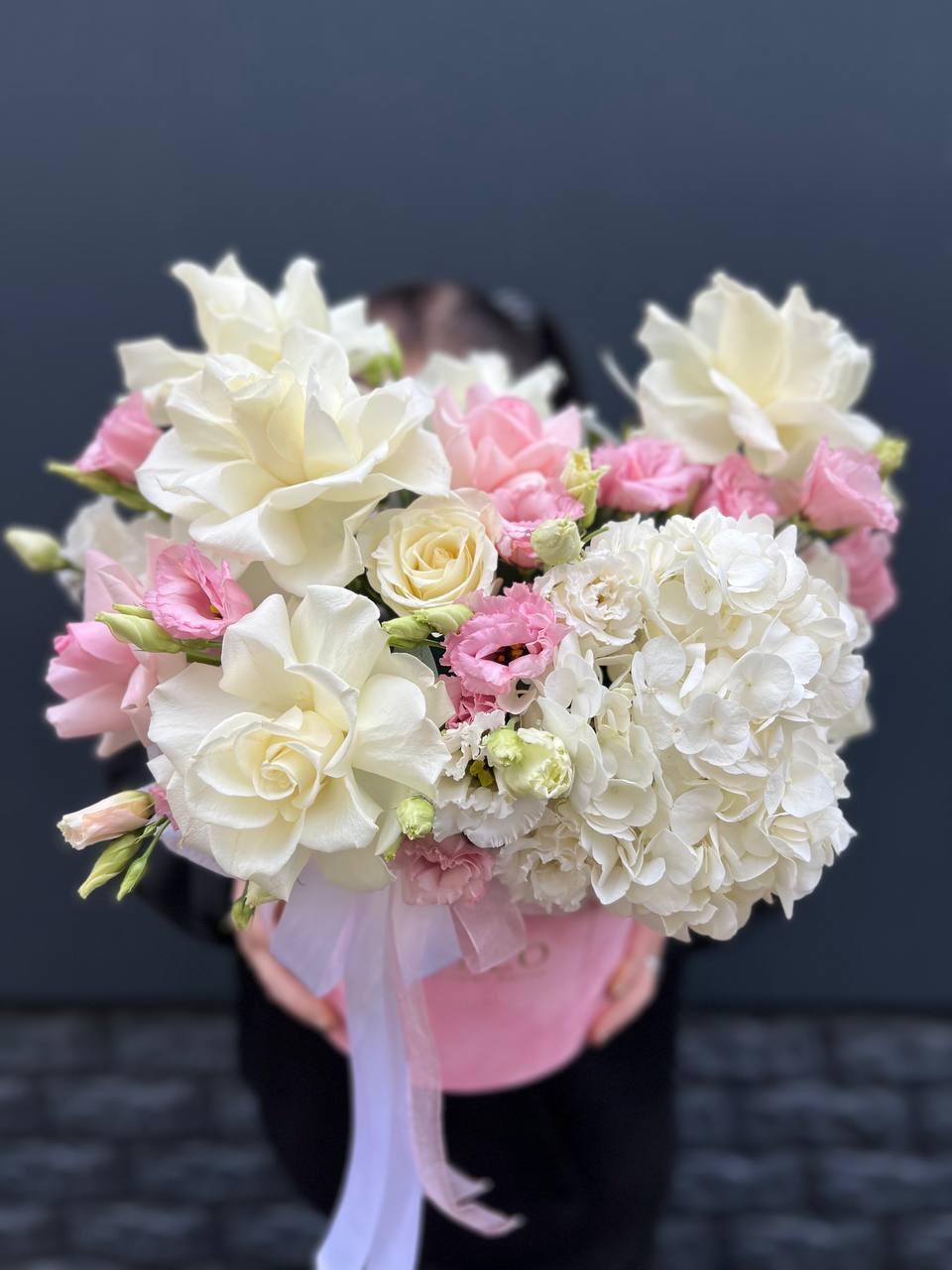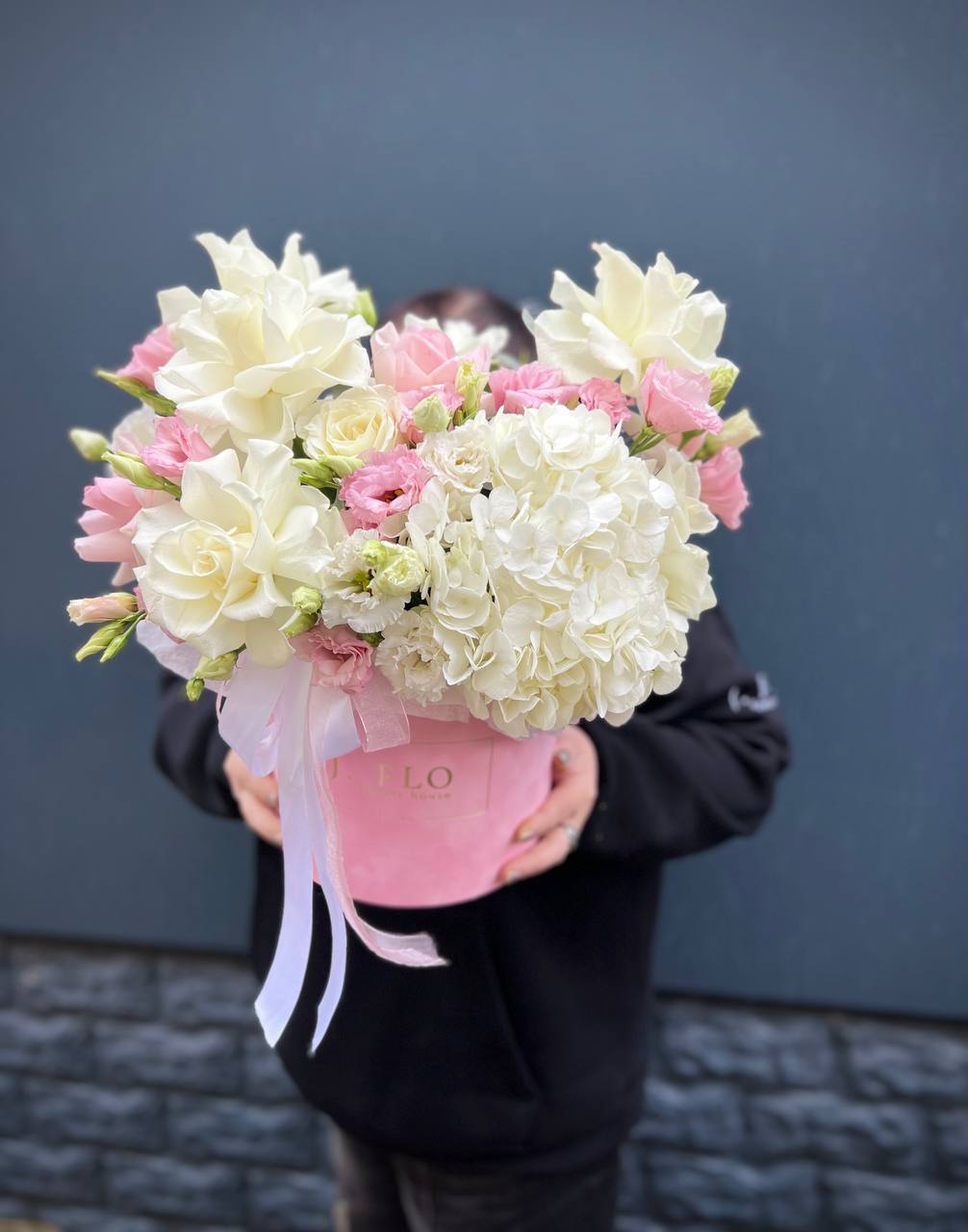 Эустомы и пионовидные розы соседствуют с французскими макарон в коробке в форме сердца. Диантусы и эвкалипт создают объём, а сладкий акцент делает композицию завершённой.
