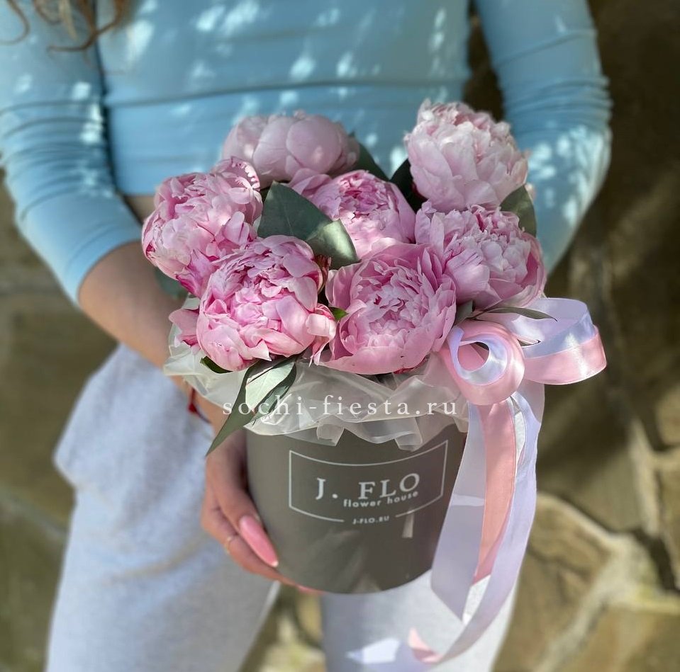 Семь пионов в компактном цилиндре образуют плотную композицию с выразительным силуэтом. Серебристая зелень эвкалипта задаёт вертикальный ритм и добавляет воздушности общей форме.