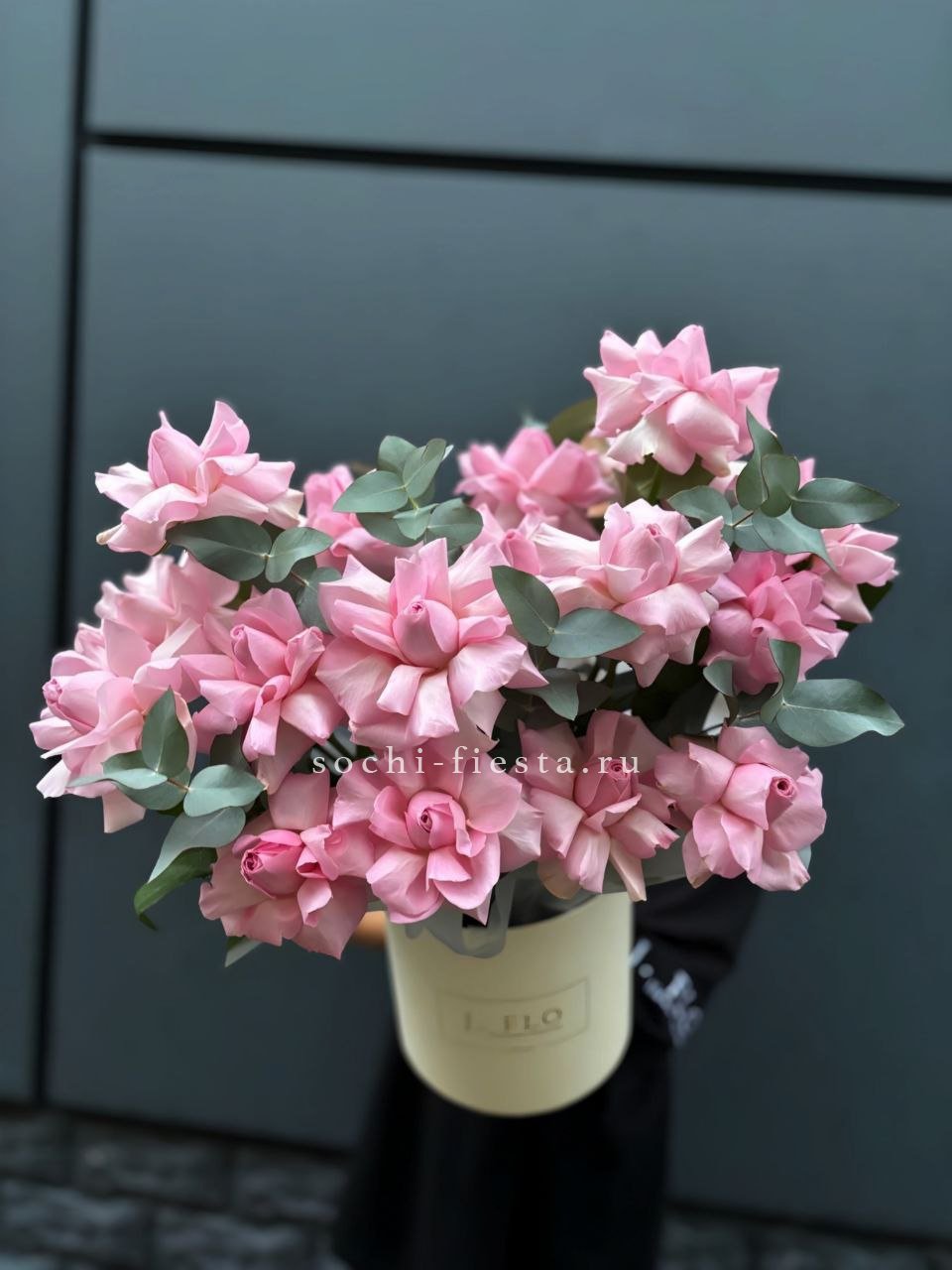 цветочная композиция, выполненная в бежевом цилиндре диаметром 20 см.