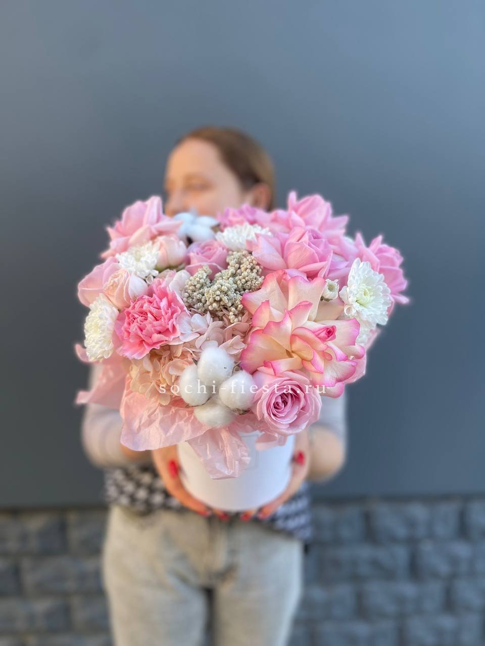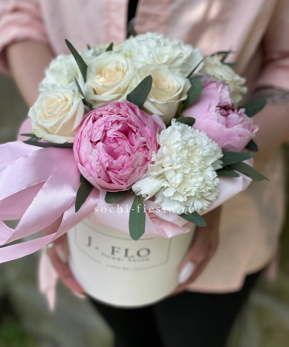 пионы, розы одноголовые, диантусы, тишью, коробка D13 Цвет коробки может быть согласован с заказчиком.
