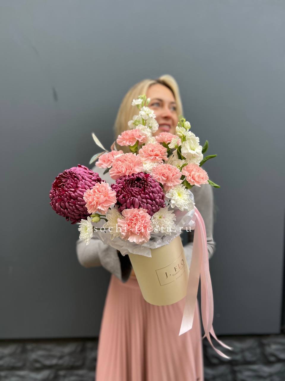 Хризнтема одноголовая, маттиола, диантус, тишью, коробка D13 Цвет коробки может быть согласован с заказчиком.