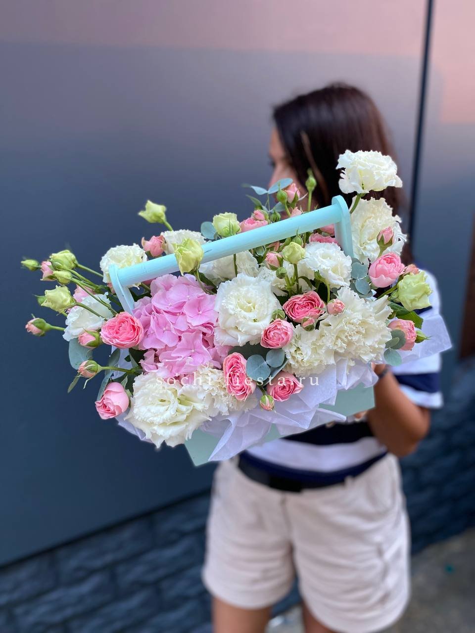 эустома, кустовая роза, фисташка, гортензия, деревянный ящик.