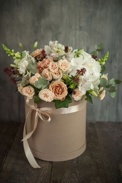 гортензии, эустома, розы, бомбастик, эвкалипт, антиринум в боксе 25.