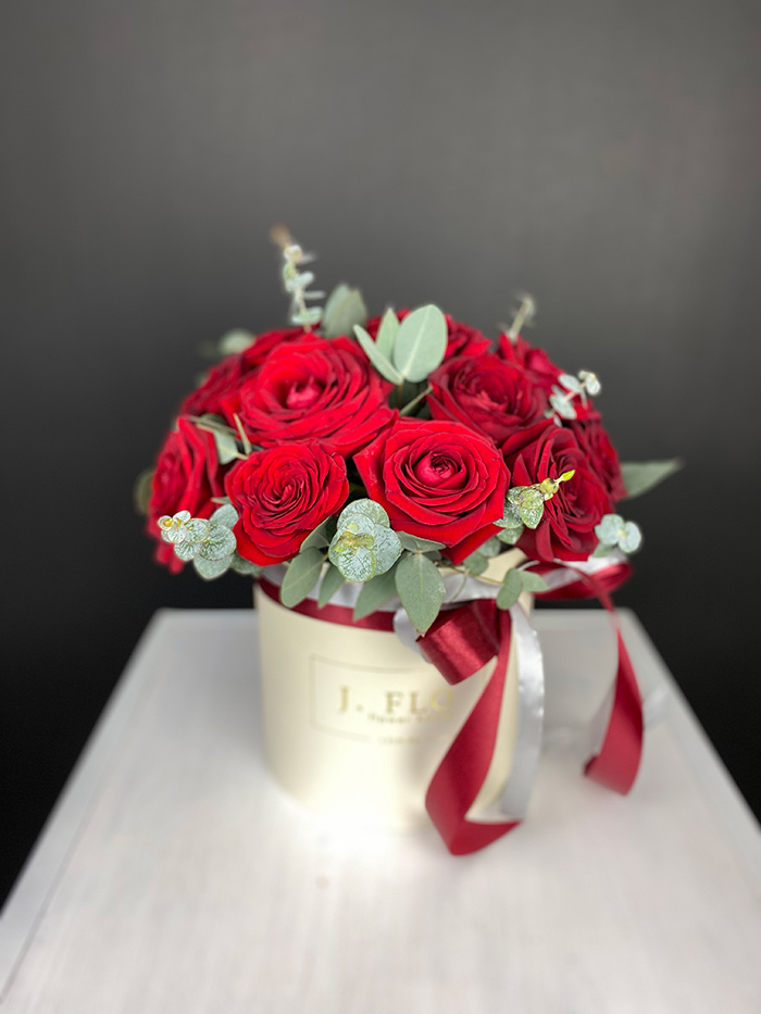 красная и розовая роза, озатамус, диантус, мисти баблс, эвкалипт, бокс 20.