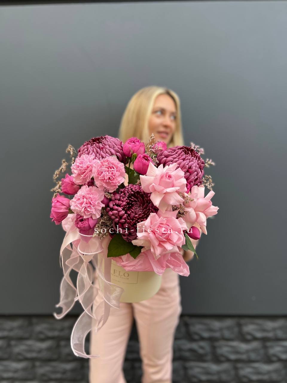 Хризантемы и диантусы задают воздушную текстуру, а мисти бабблс добавляет композиции объем. Лимониум вплетается между бутонами, создавая мягкую игру оттенков.