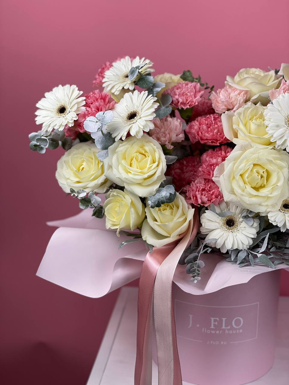 Белоснежная гамма раскрывается через лилии, розы и пышную гортензию с добавлением диантуса. Эвкалипт придает объём и глубину всей композиции в цилиндре.