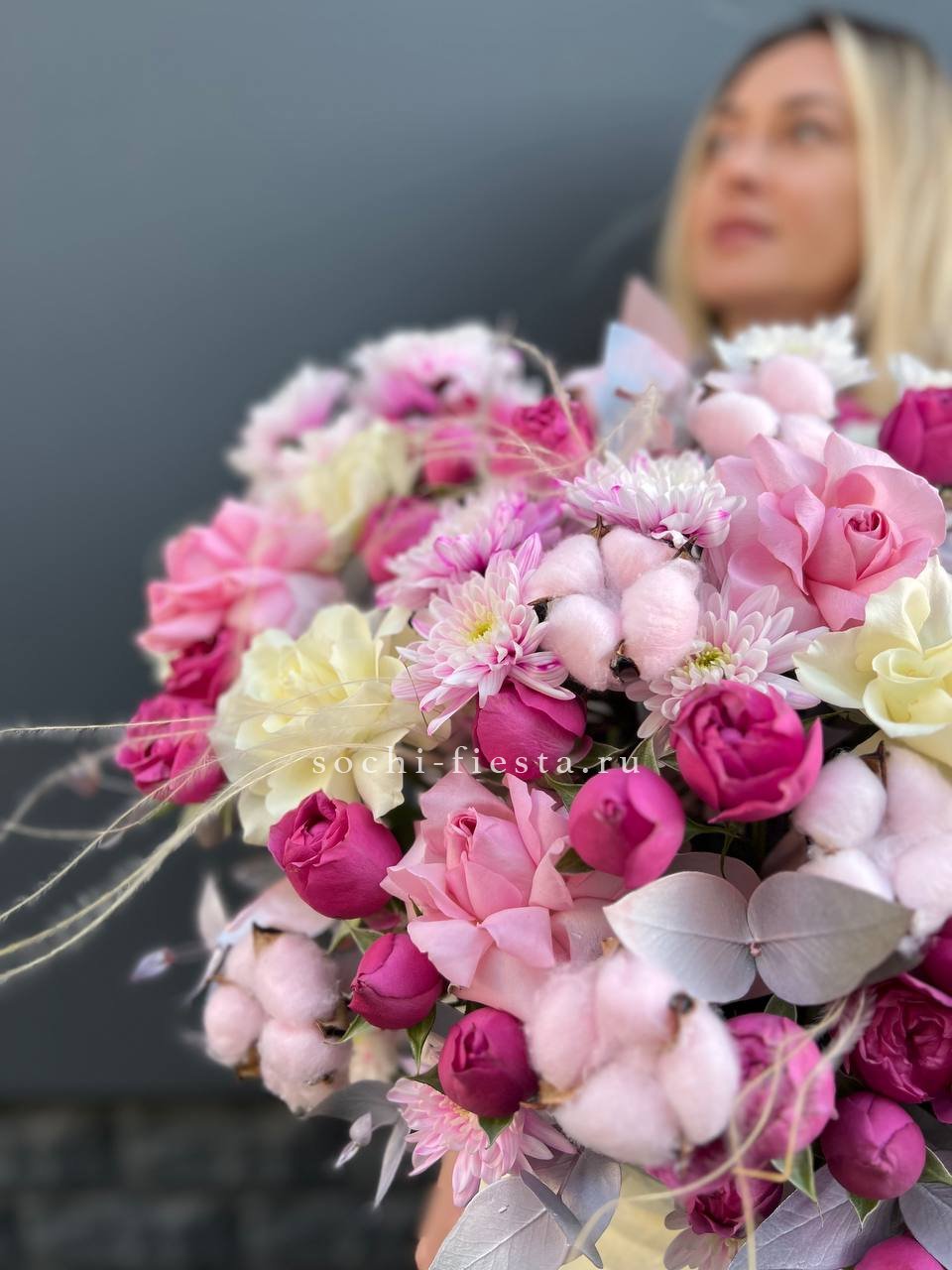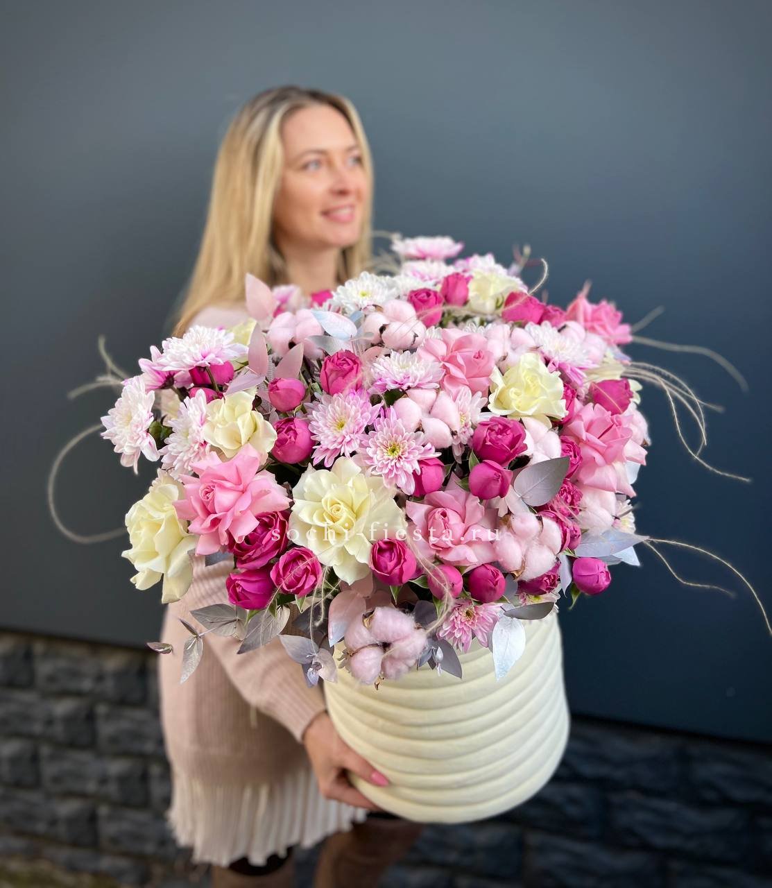 Широкий бокс объединяет пионовидные розы с пушистыми головками хлопка и воздушными метелками ковыля. Композиция построена на слоях: плотные бутоны у основания переходят в легкие текстуры по краям.