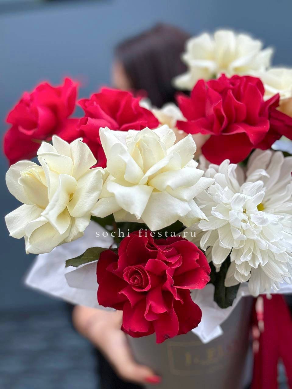 белые розы, красные розы, хризантема, цилиндр D16,  лента.