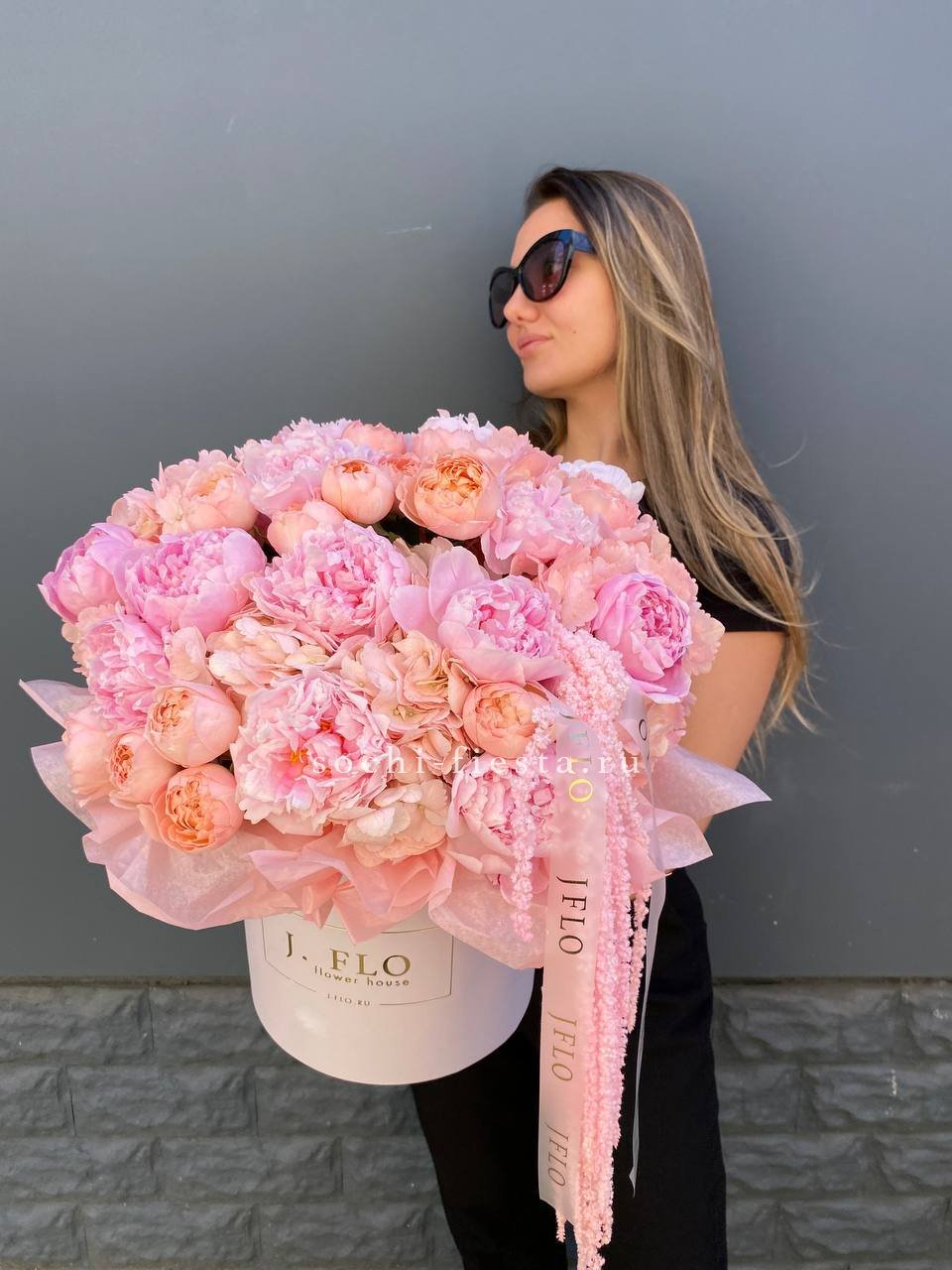 гортензии, пионы,кустовые пионовидные розы, амарант, цилиндр D 20,  бумага тишью.