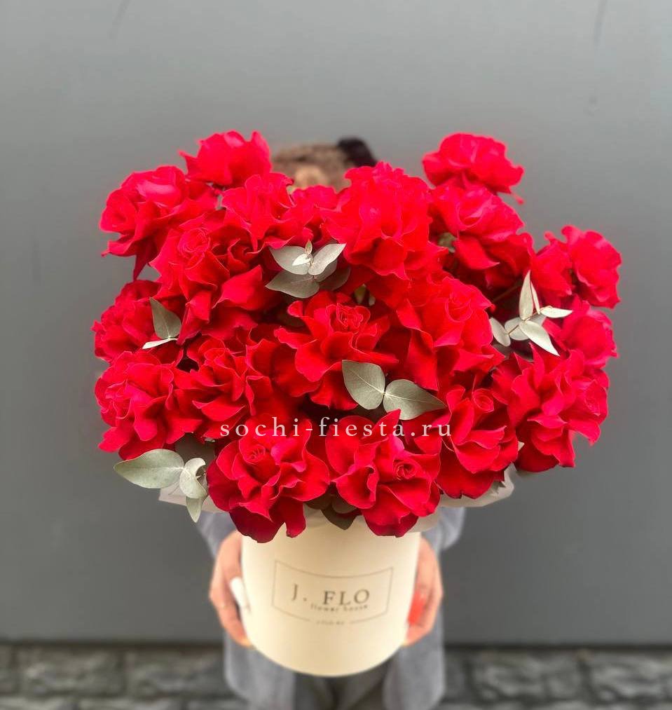 Пионовидные кустовые розы собраны плотно, создавая объёмную композицию с живой текстурой. Лимониум и эвкалипт добавляют воздушности, а цилиндр собирает всё в компактную форму.