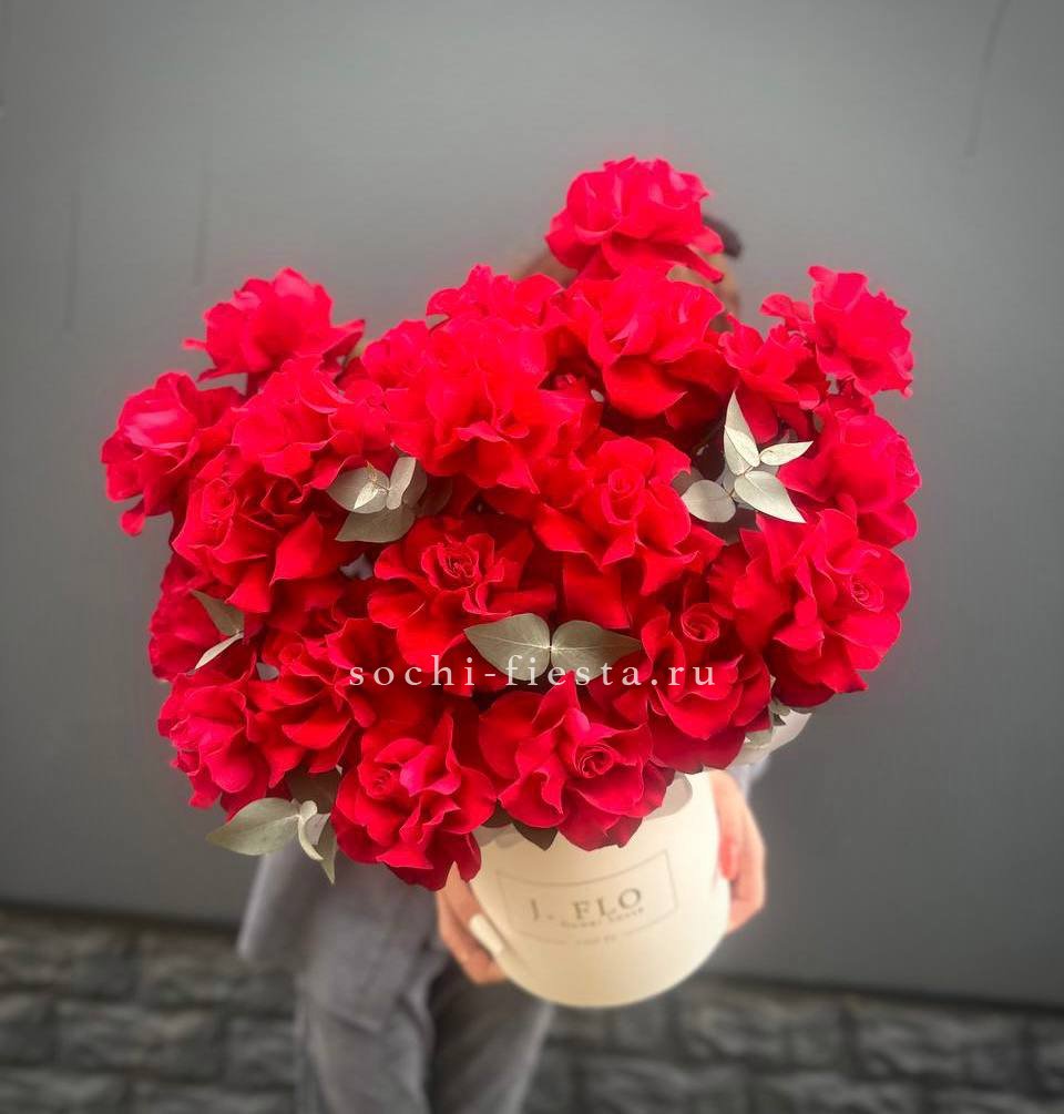 пионовидные кустовые розы, эвкалипт, лимониум, зелень, лента, цилиндр D16.