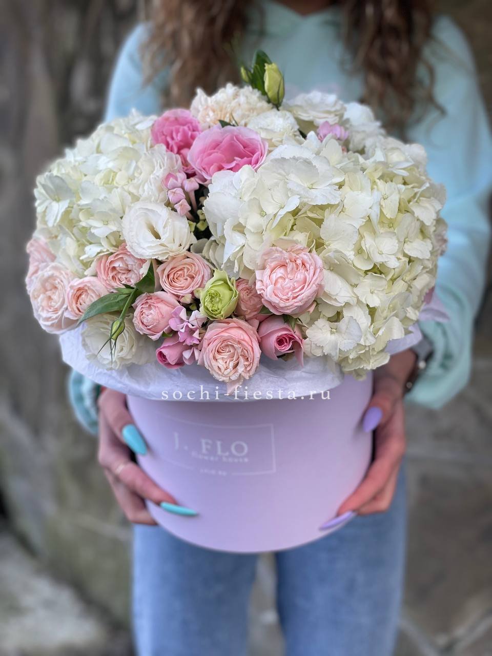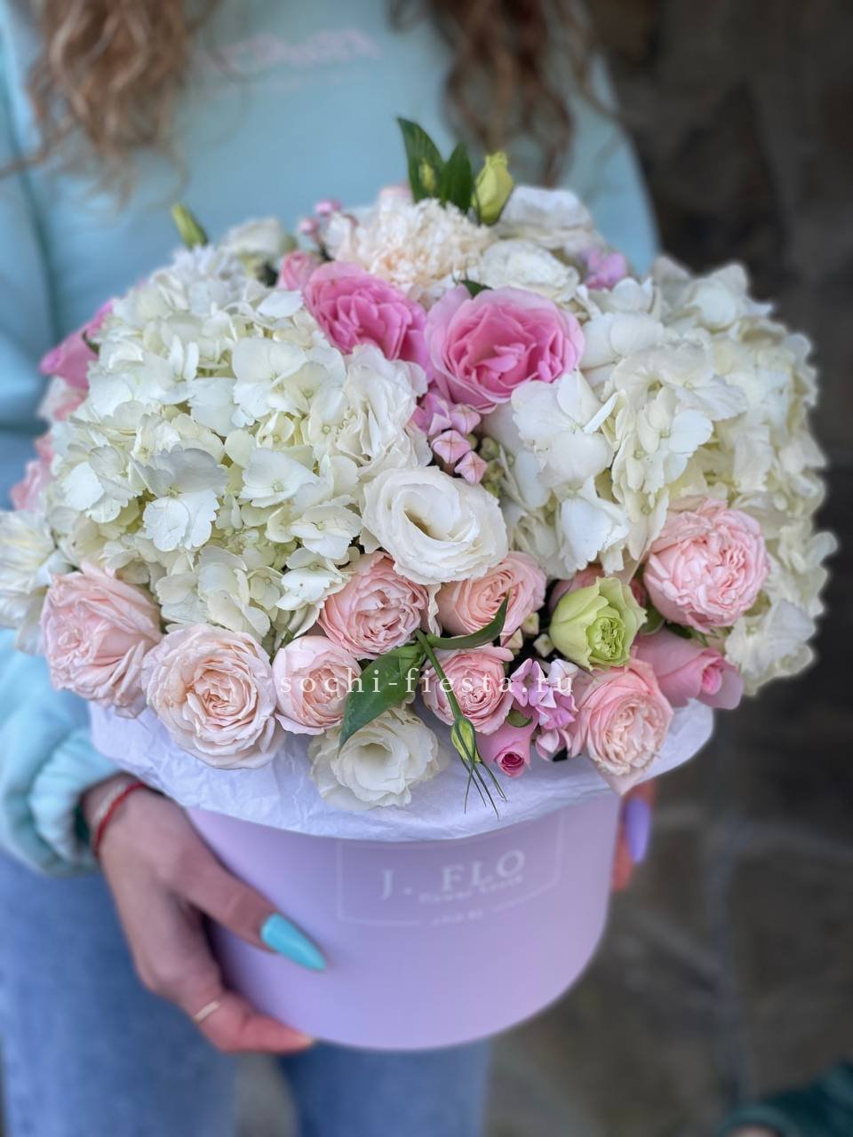 Розовая палитра переходит от французских роз к кустовым Джульетта с добавлением хлопка. Композиция в цилиндре сочетает воздушность и плотность фактур.